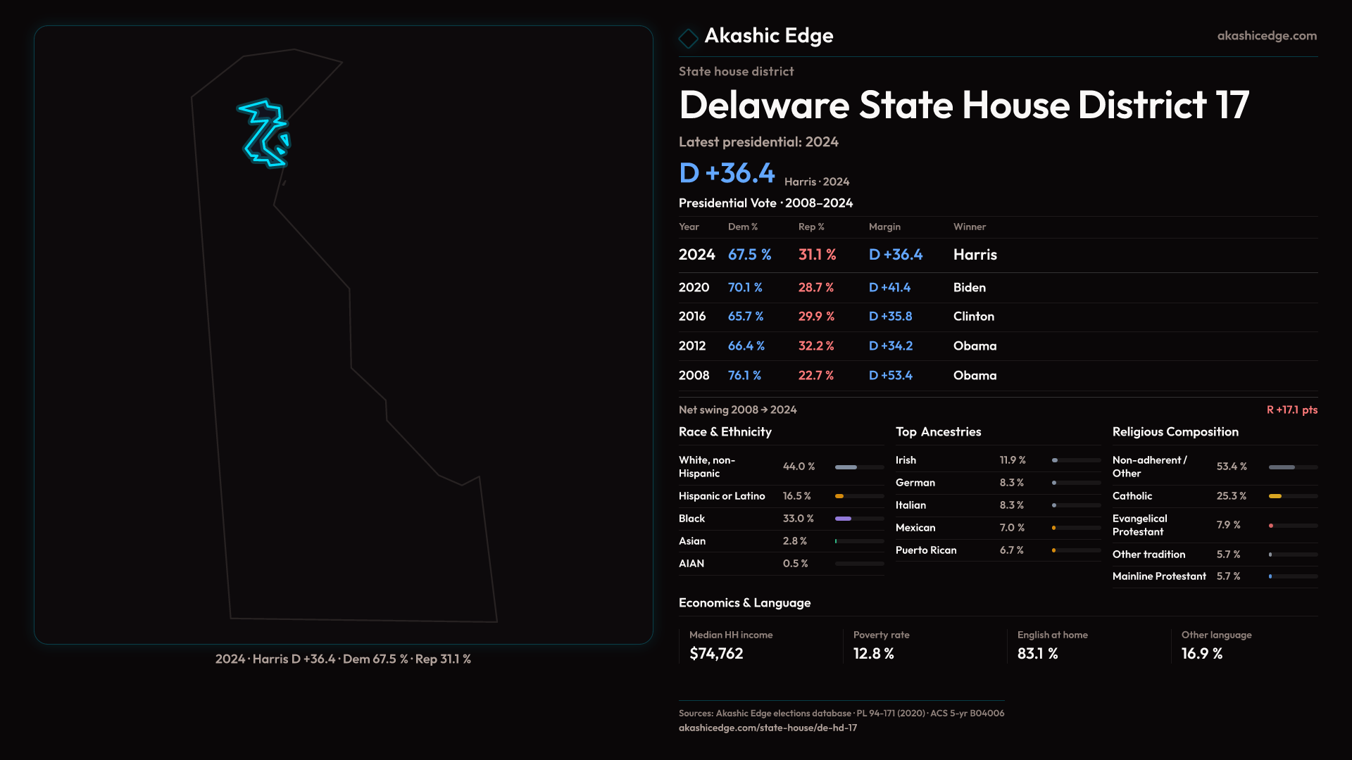 Safe Democratic — shifted 5.1pp toward Republicans in 2024 — 25K residents
