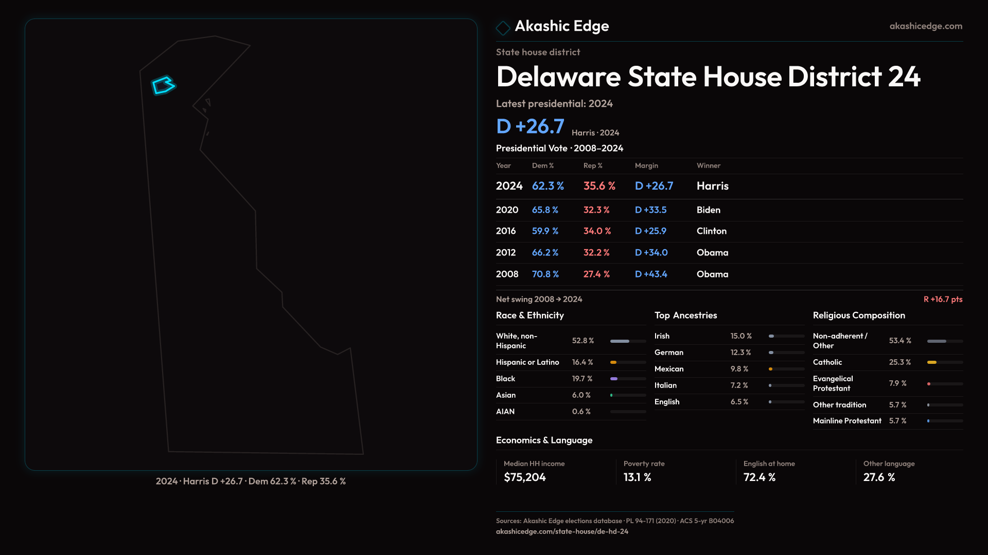 Safe Democratic — shifted 6.8pp toward Republicans in 2024 — 25K residents