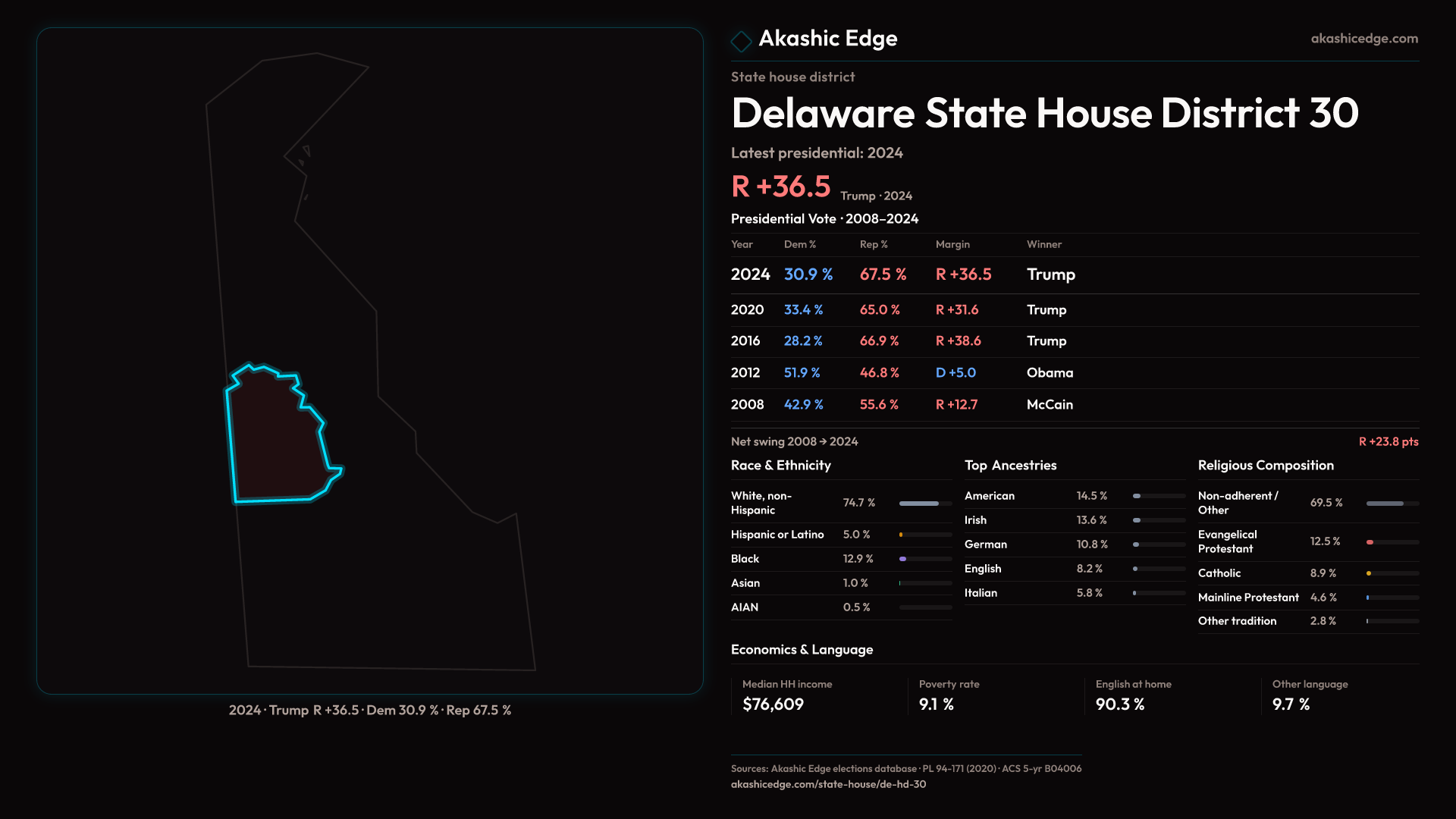 Who lives in Delaware State House District 30? 24,785 residents as of the 2020 Census.