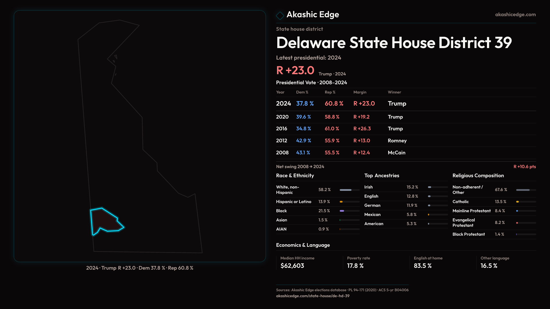 Who lives in Delaware State House District 39? 23,622 residents as of the 2020 Census.