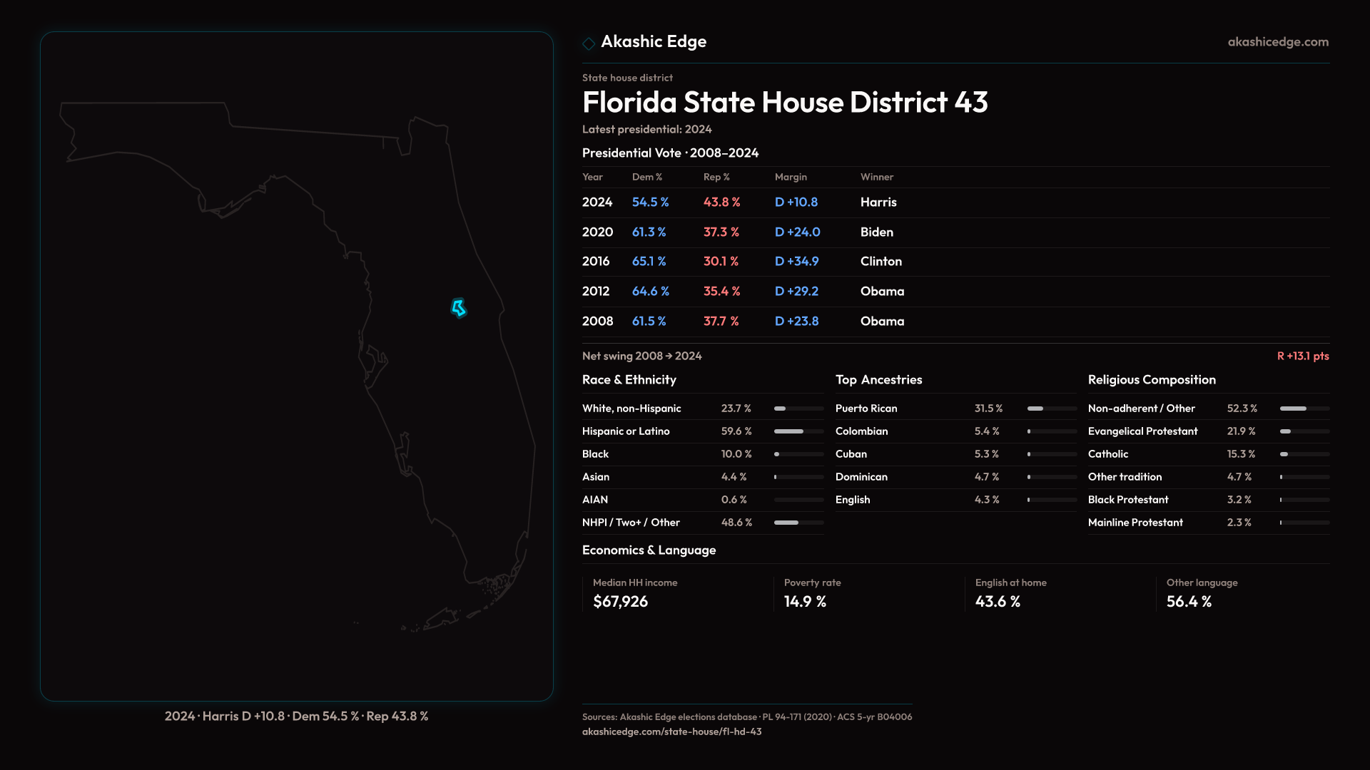 Who lives in Florida State House District 43? 175,629 residents as of the 2020 Census.