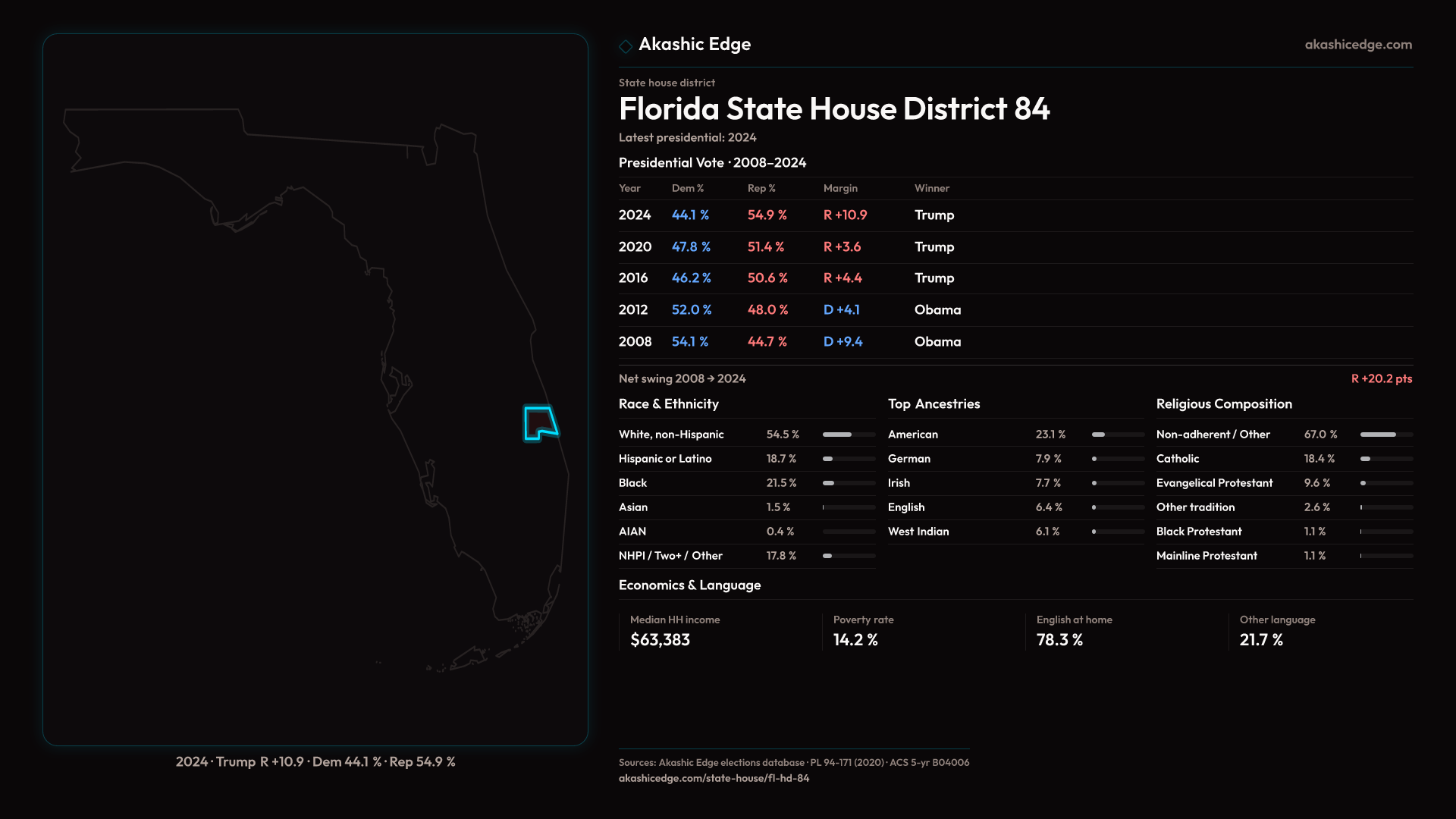 Who lives in Florida State House District 84? 183,408 residents as of the 2020 Census.