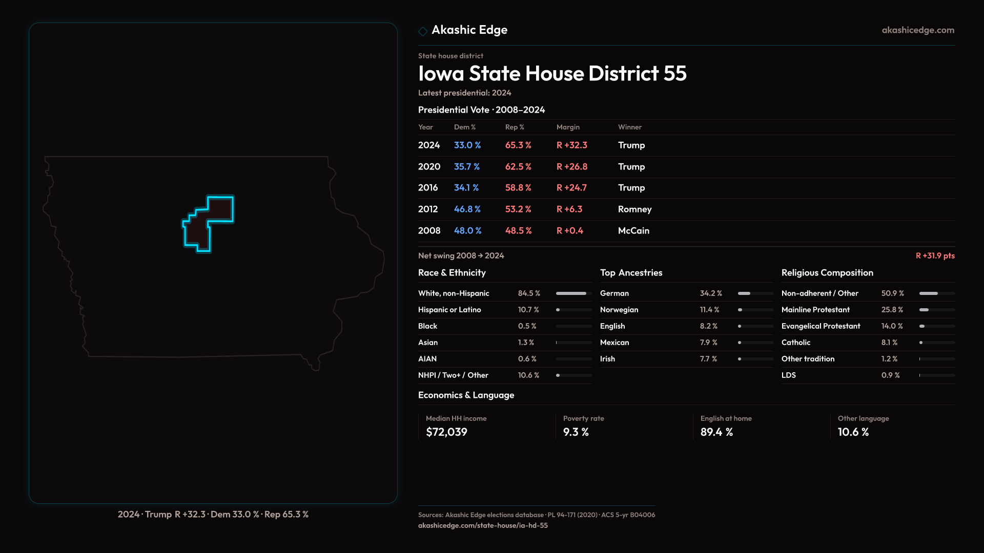 Safe Republican — shifted 5.5pp toward Republicans in 2024 — 32K residents