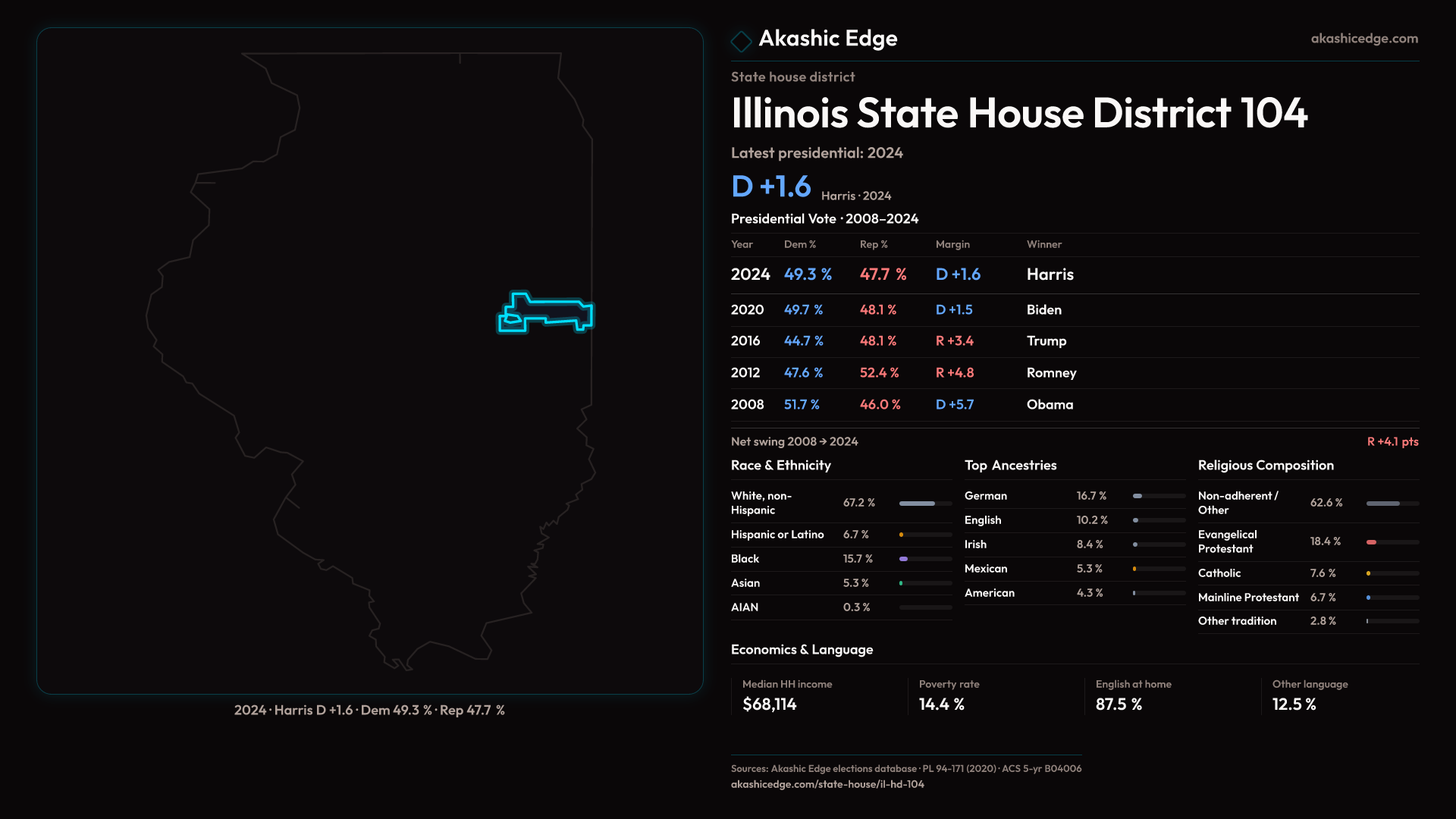 Who lives in Illinois State House District 104? 108,612 residents as of the 2020 Census.