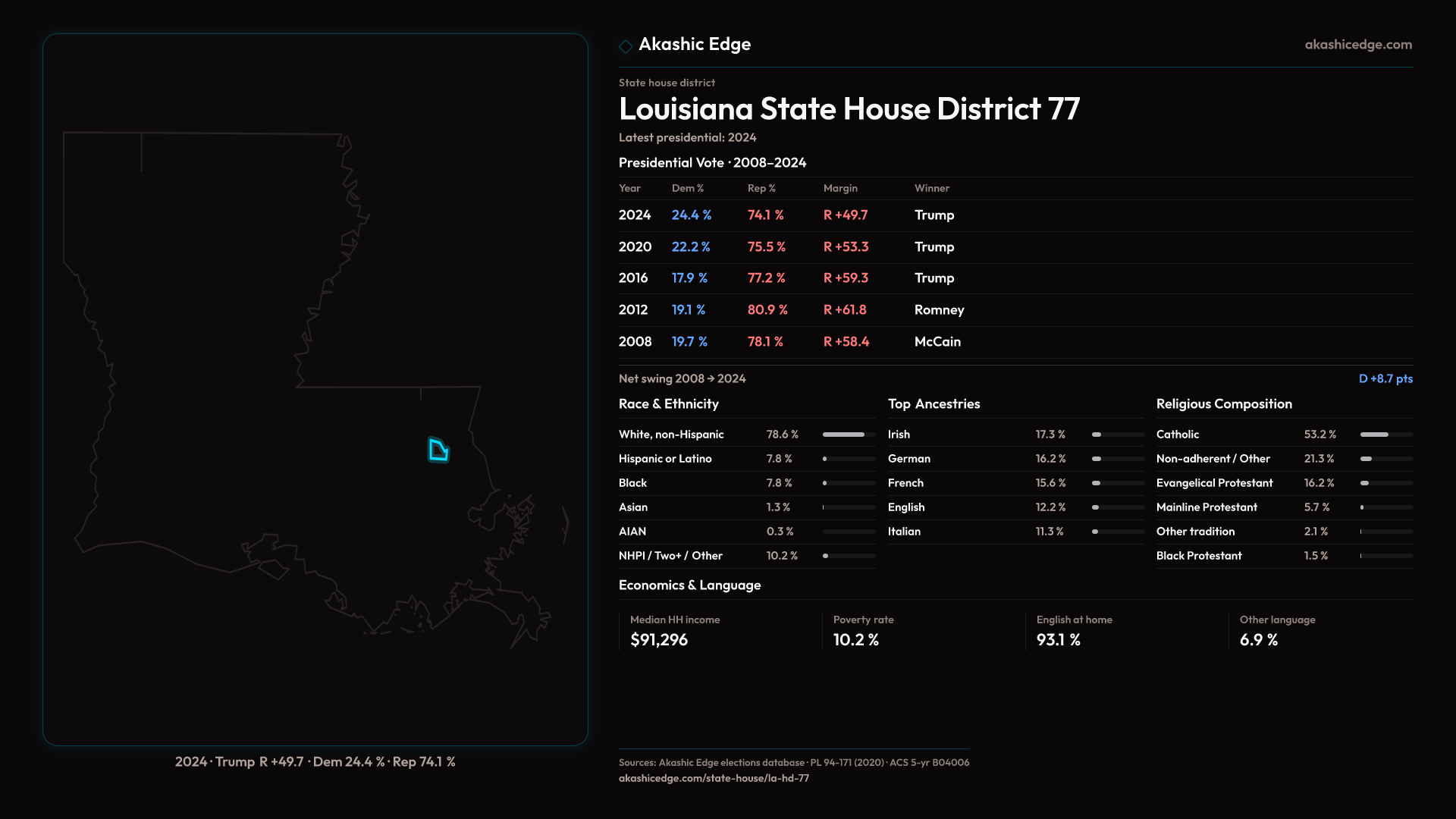Read this geography's profile in three layers: local, state (where available), and national baseline.