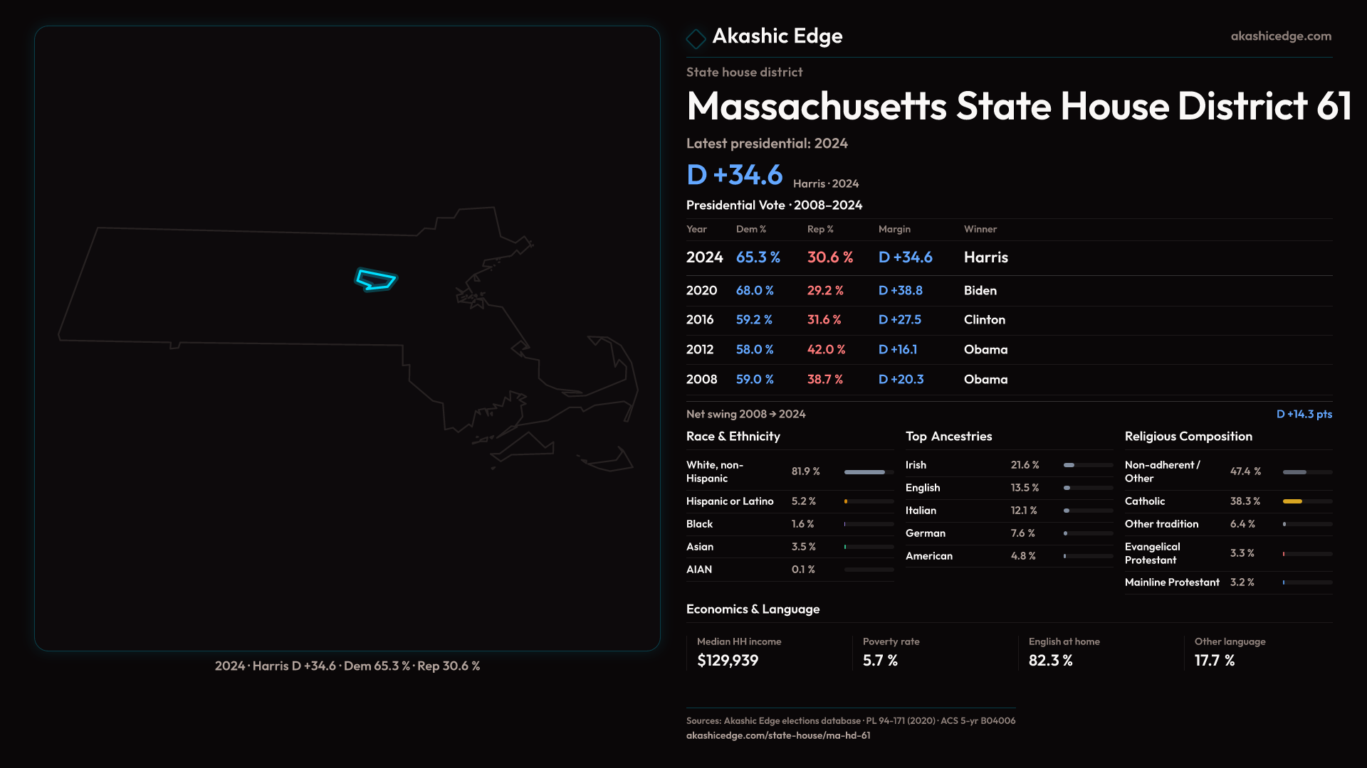 Safe Democratic — shifted 4.2pp toward Republicans in 2024 — 44K residents