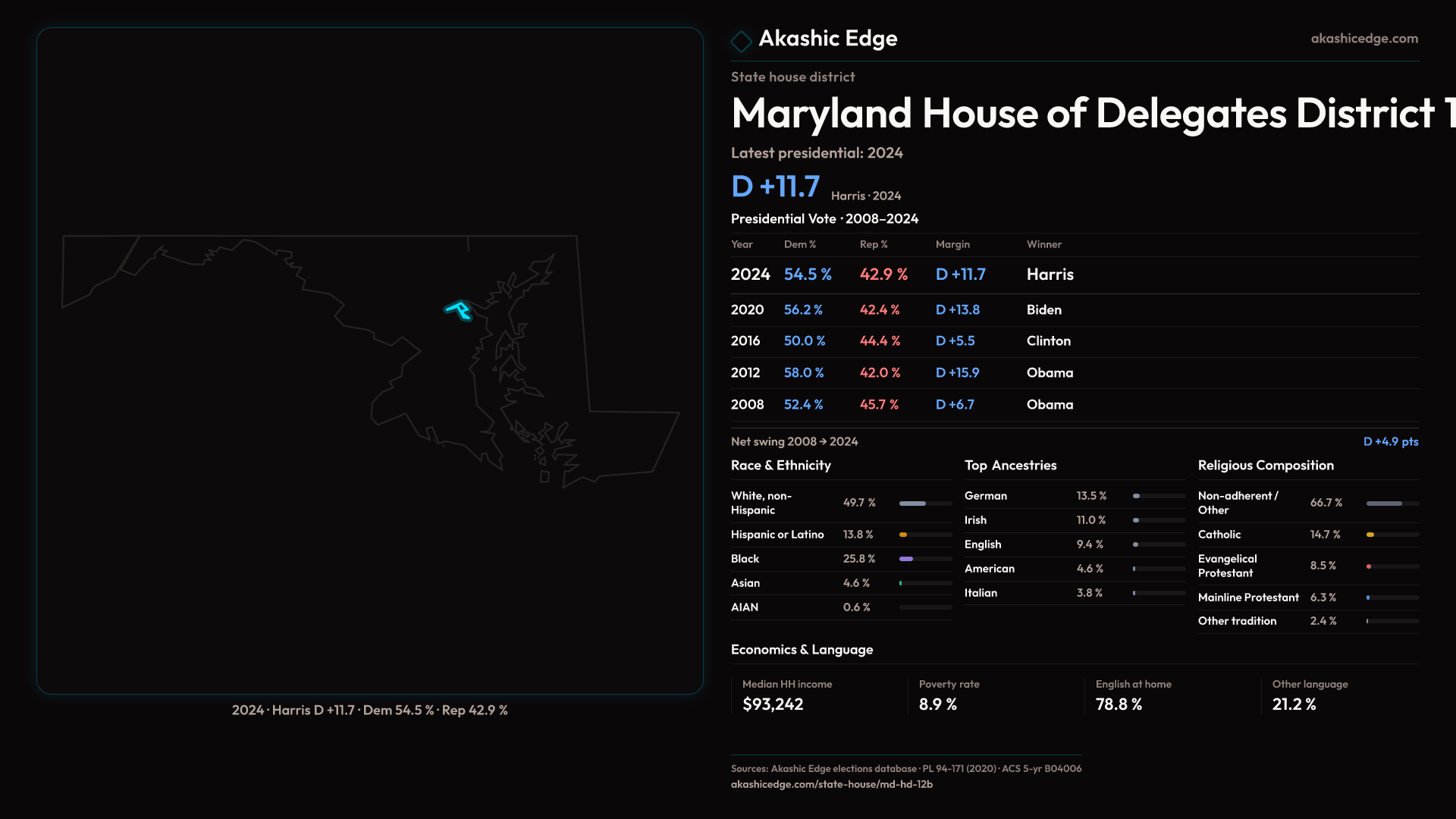 Who lives in Maryland House of Delegates District 12B? 45,293 residents as of the 2020 Census.