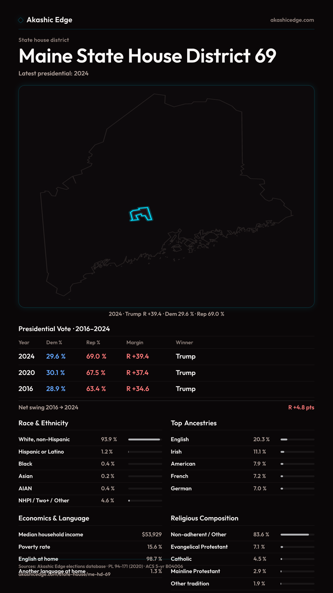 Who lives in Maine State House District 69? 8,752 residents as of the 2020 Census.