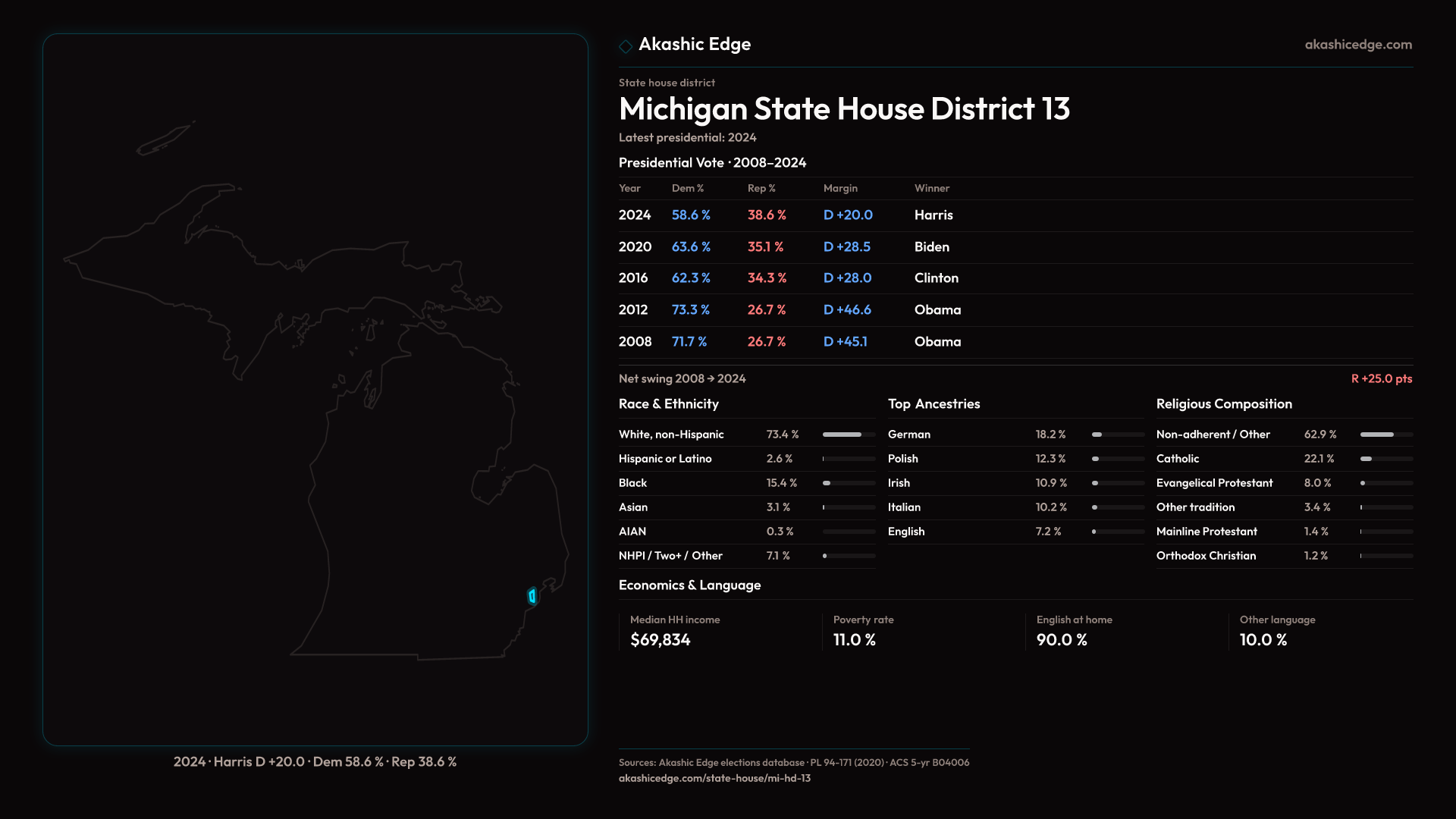 Safe Democratic — shifted 8.4pp toward Republicans in 2024 — 90K residents
