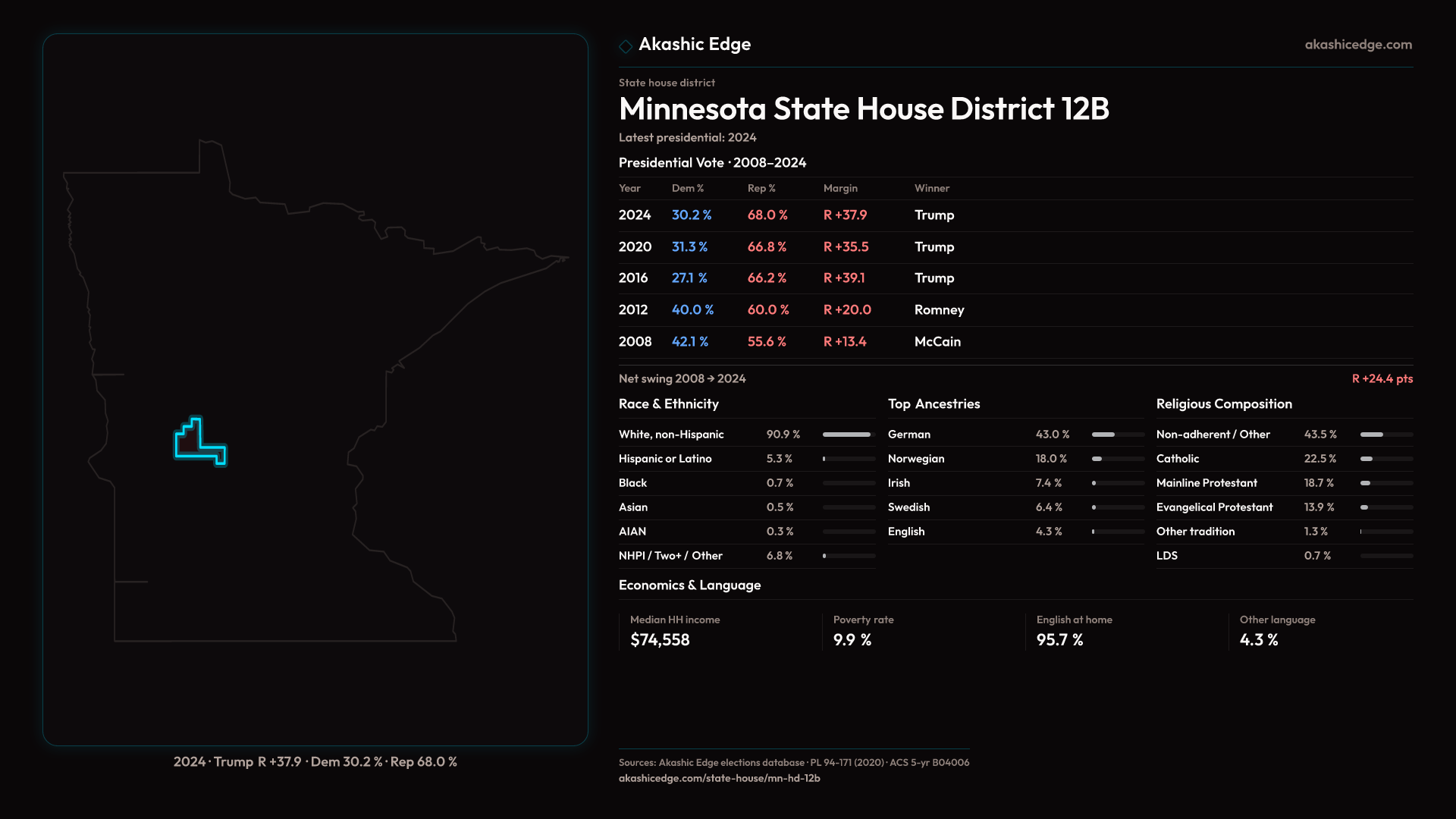 Who lives in Minnesota State House District 12B? 42,869 residents as of the 2020 Census.