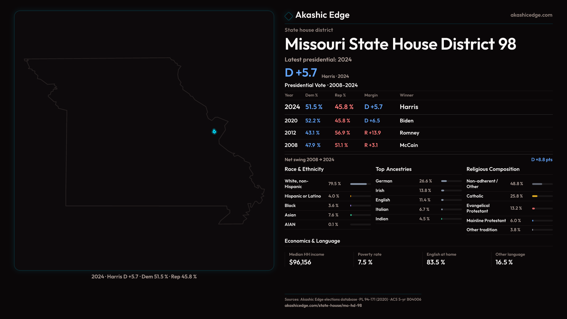 Who lives in Missouri State House District 98? 38,834 residents as of the 2020 Census.