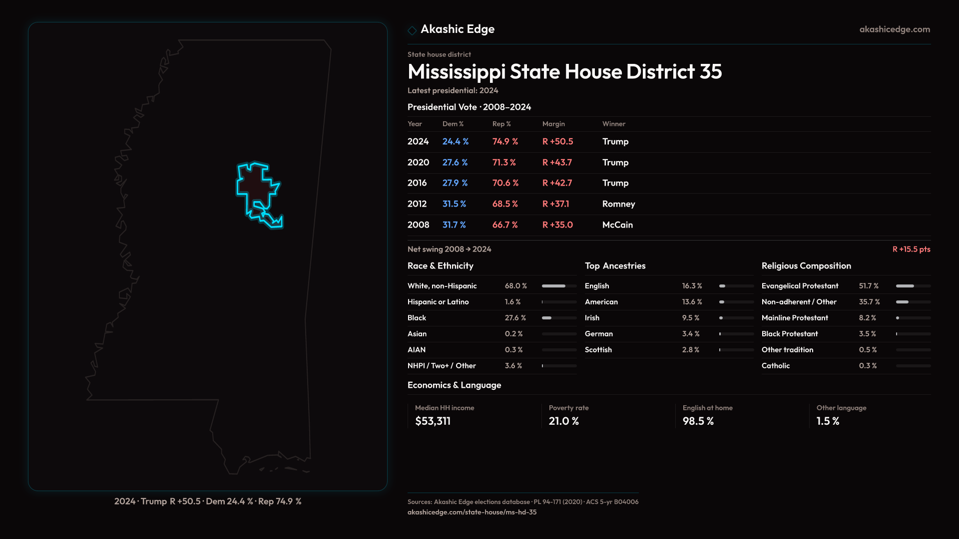 Safe Republican — shifted 6.7pp toward Republicans in 2024 — 23K residents