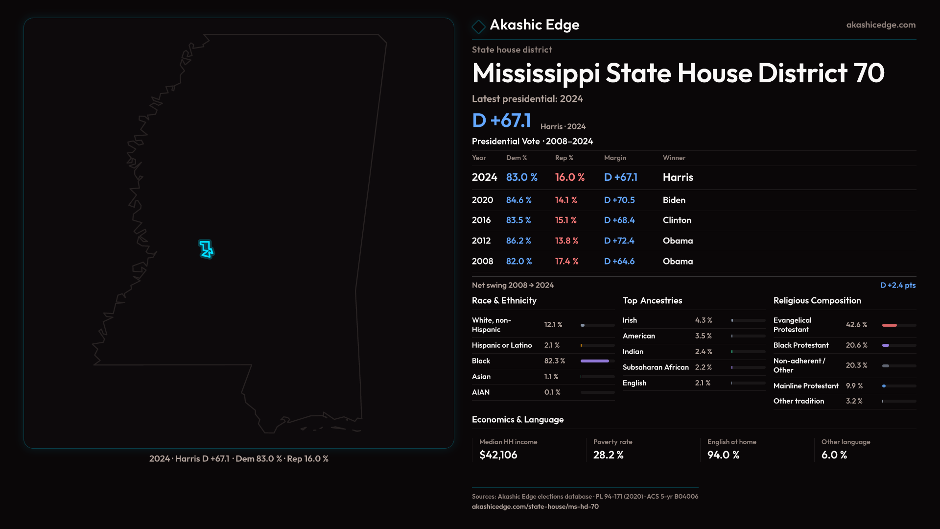 Read this geography's profile in three layers: local, state (where available), and national baseline.