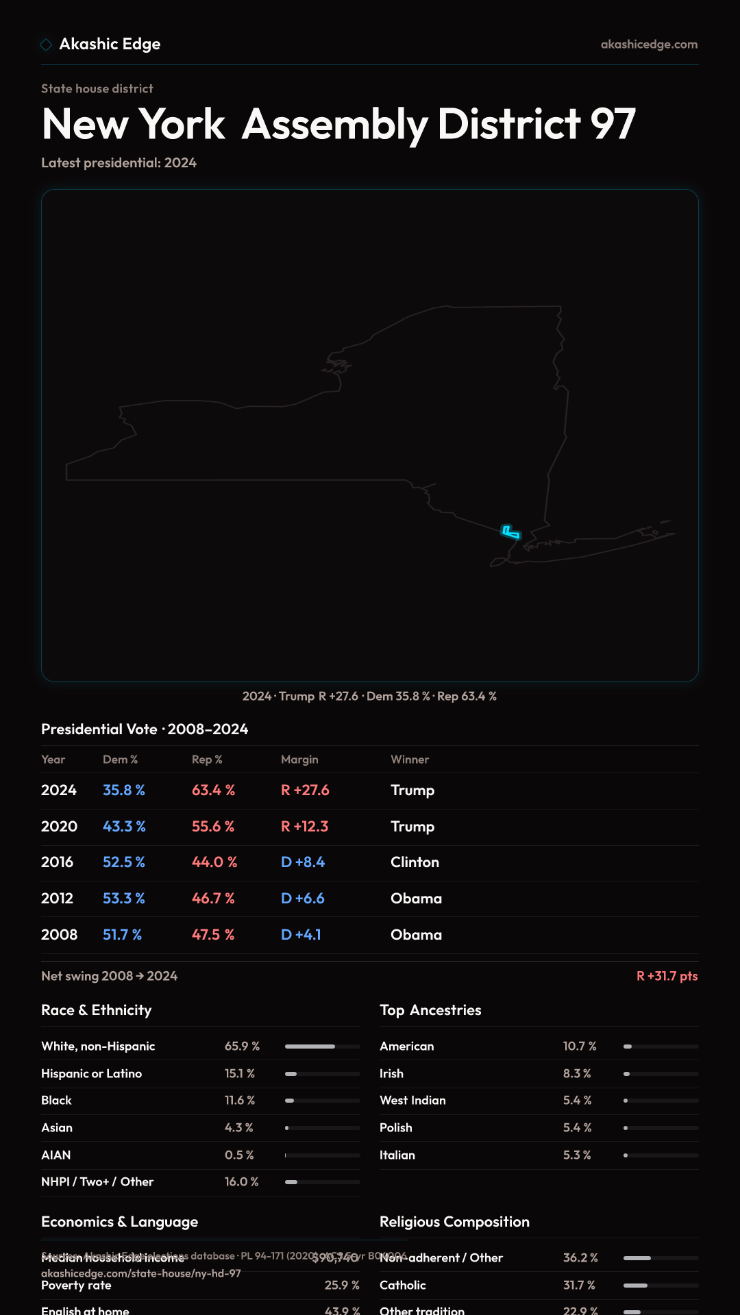 Who lives in New York Assembly District 97? 136,316 residents as of the 2020 Census.