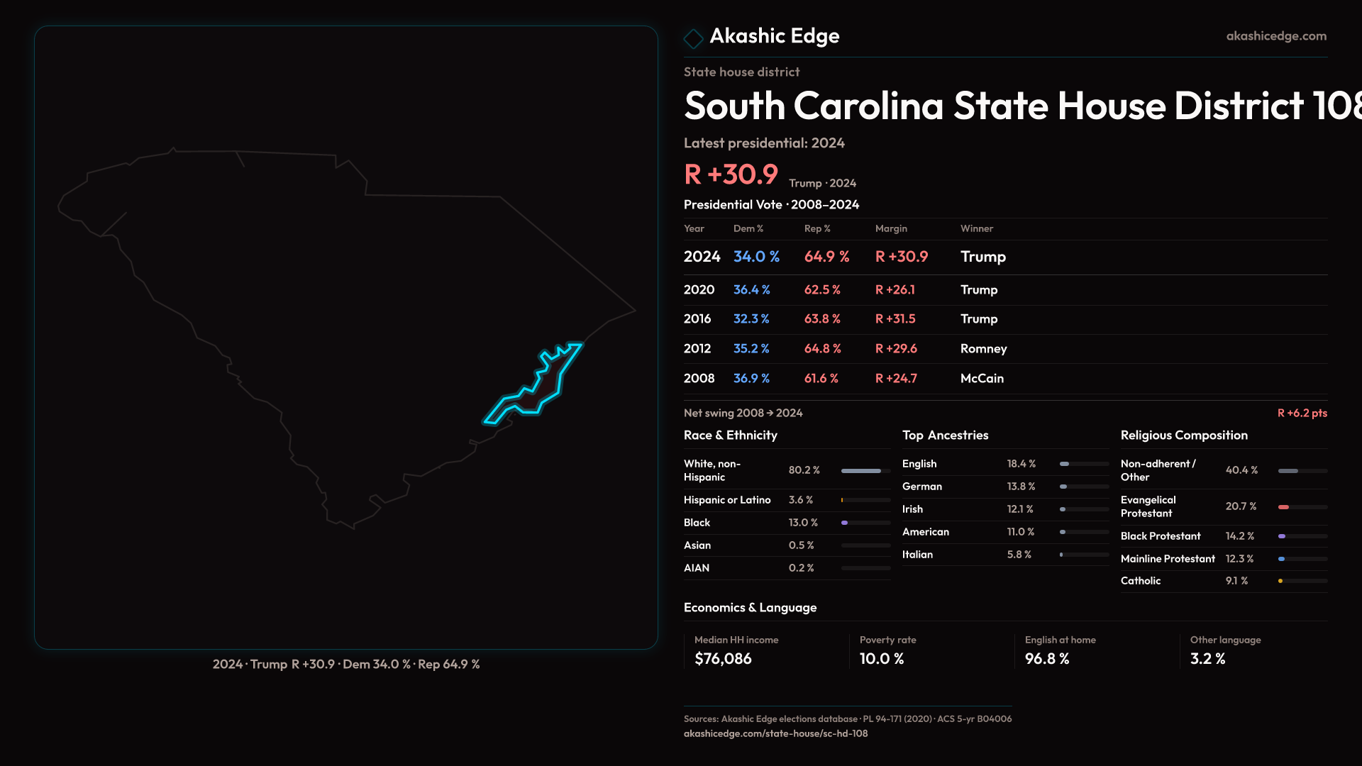 Who lives in South Carolina State House District 108? 40,316 residents as of the 2020 Census.
