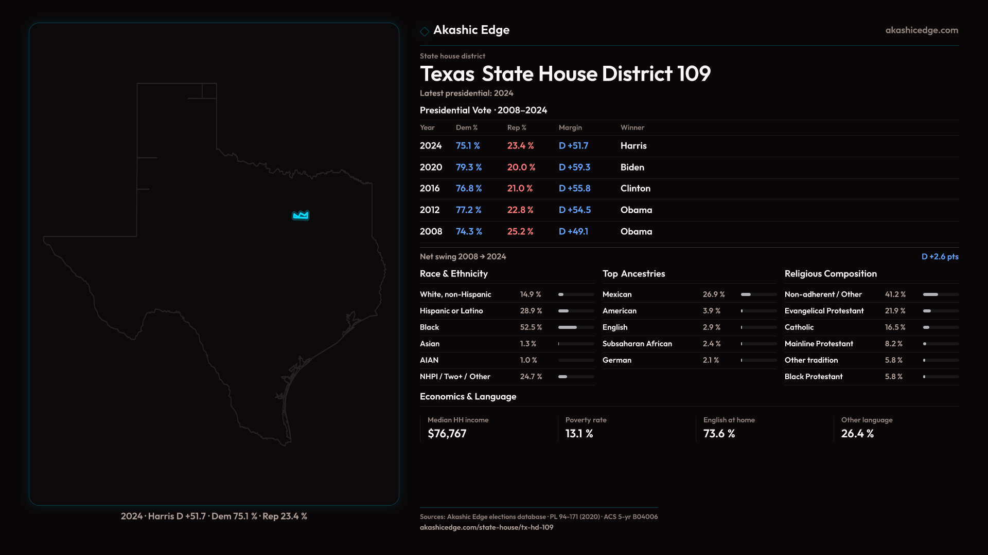 Who lives in Texas State House District 109? 184,600 residents as of the 2020 Census.