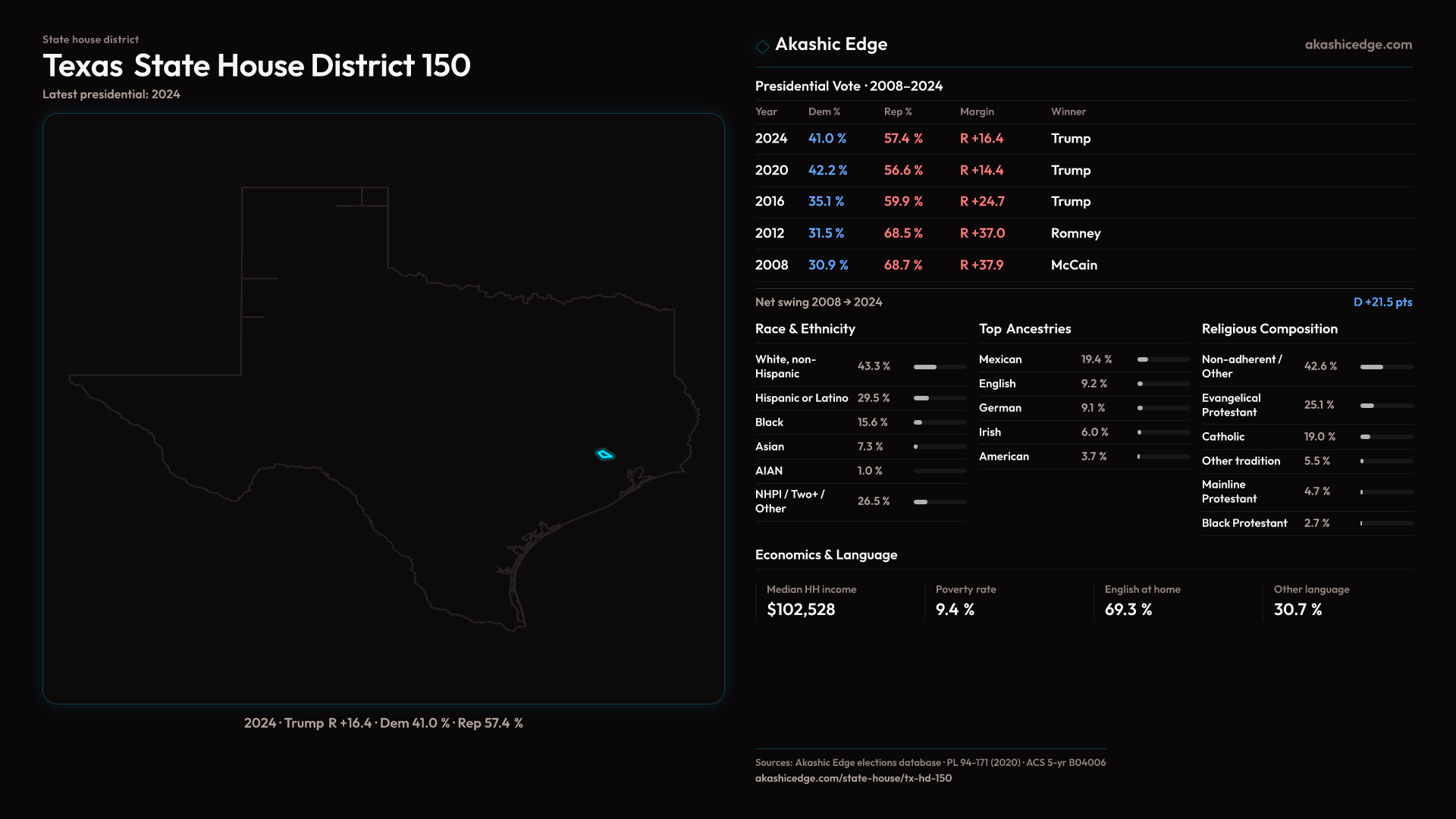 Who lives in Texas State House District 150? 195,678 residents as of the 2020 Census.