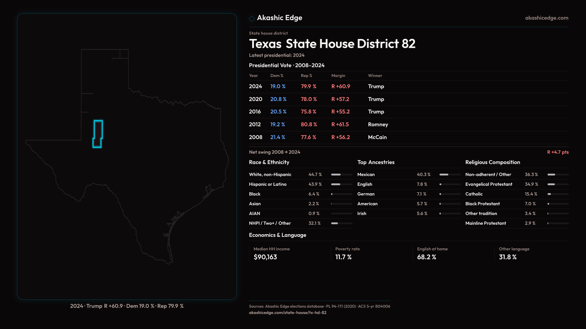 Safe Republican — shifted 3.7pp toward Republicans in 2024 — 188K residents