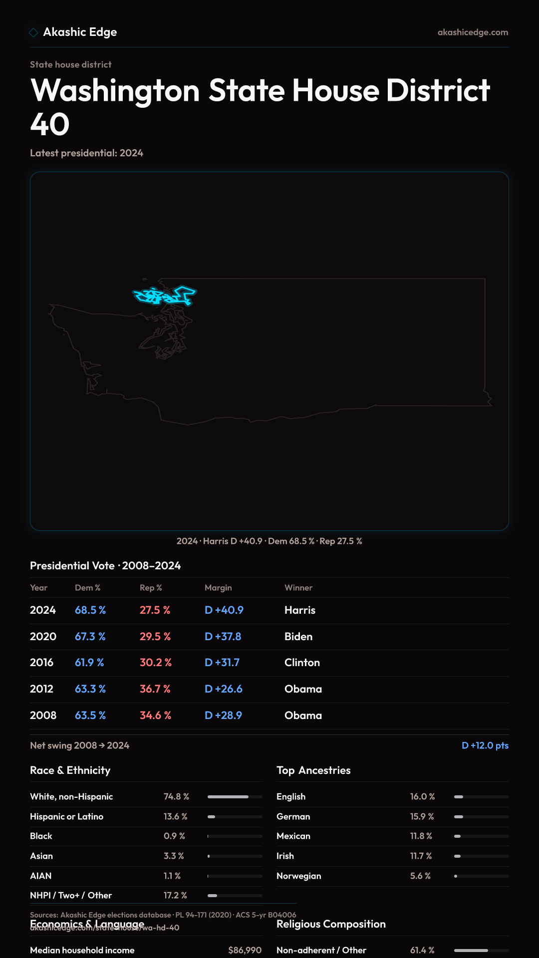 Who lives in Washington State House District 40? 156,673 residents as of the 2020 Census.