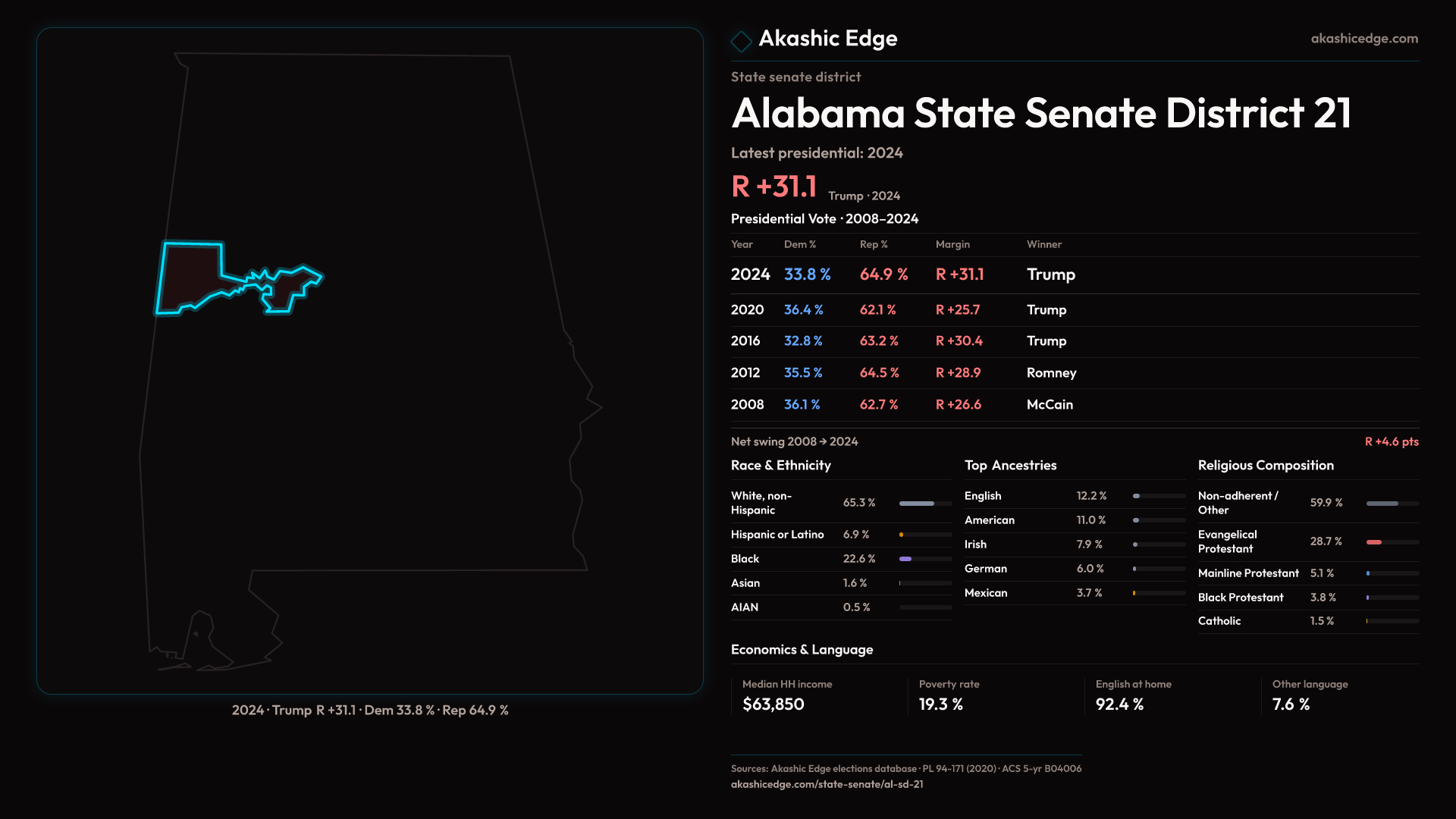 Read this geography's profile in three layers: local, state (where available), and national baseline.