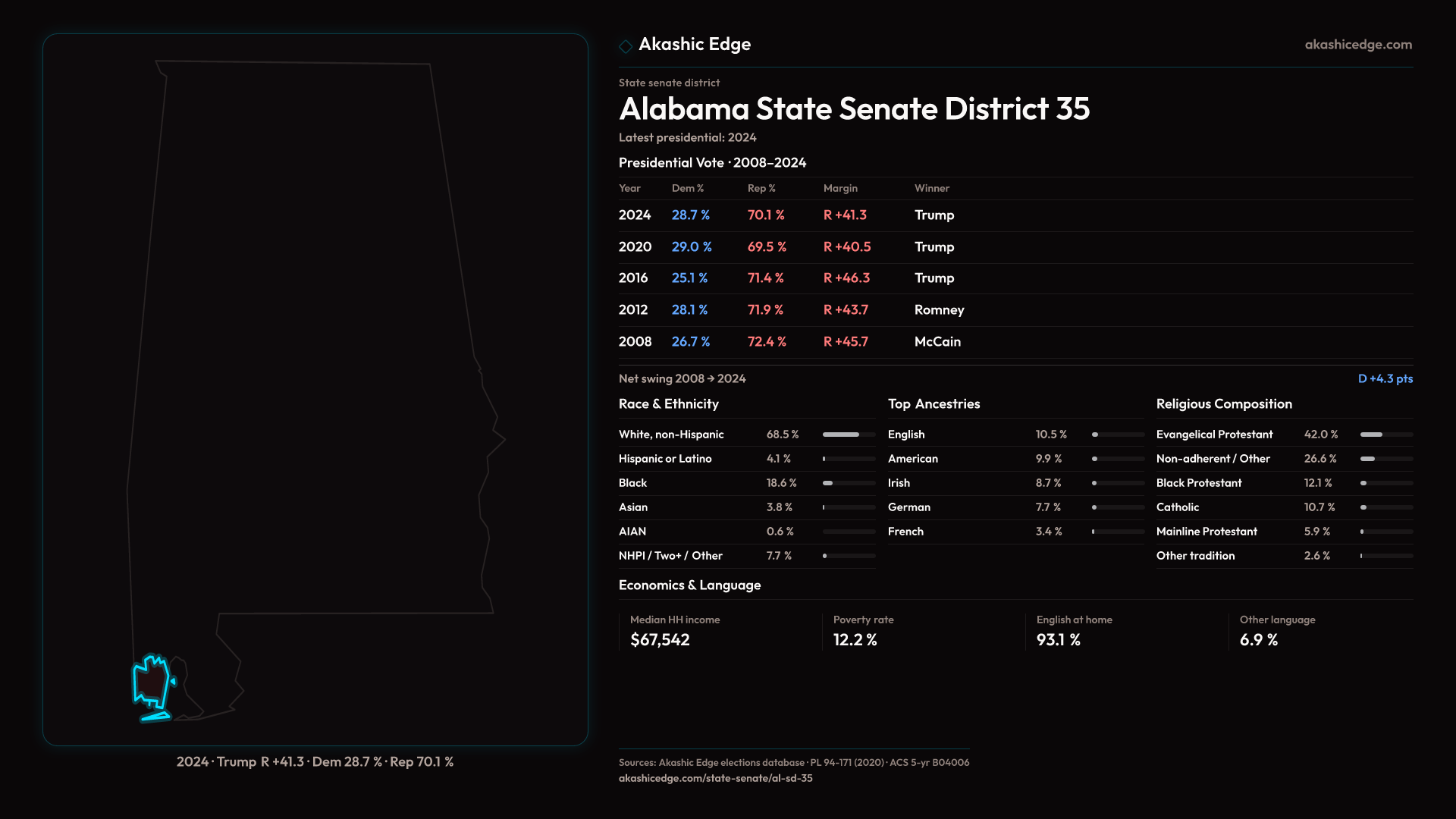 Read this geography's profile in three layers: local, state (where available), and national baseline.
