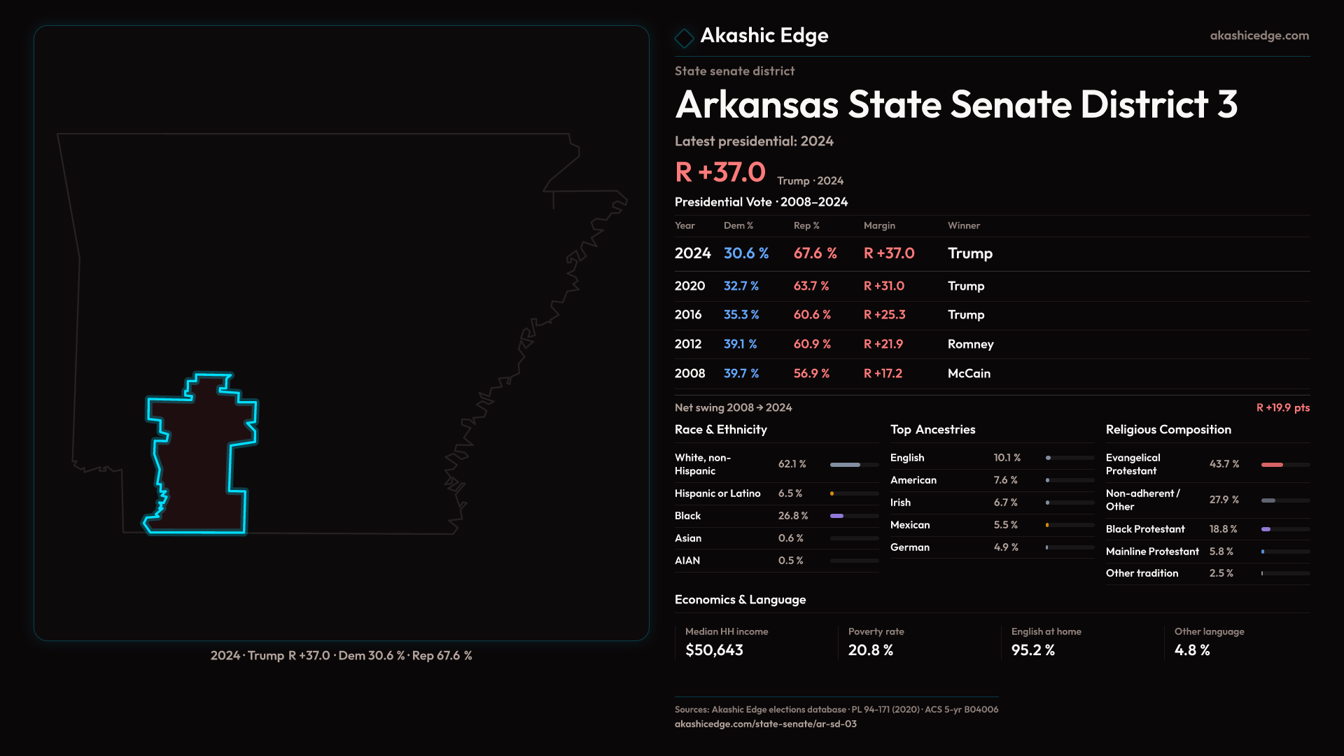 Who lives in Arkansas State Senate District 3? 85,018 residents as of the 2020 Census.