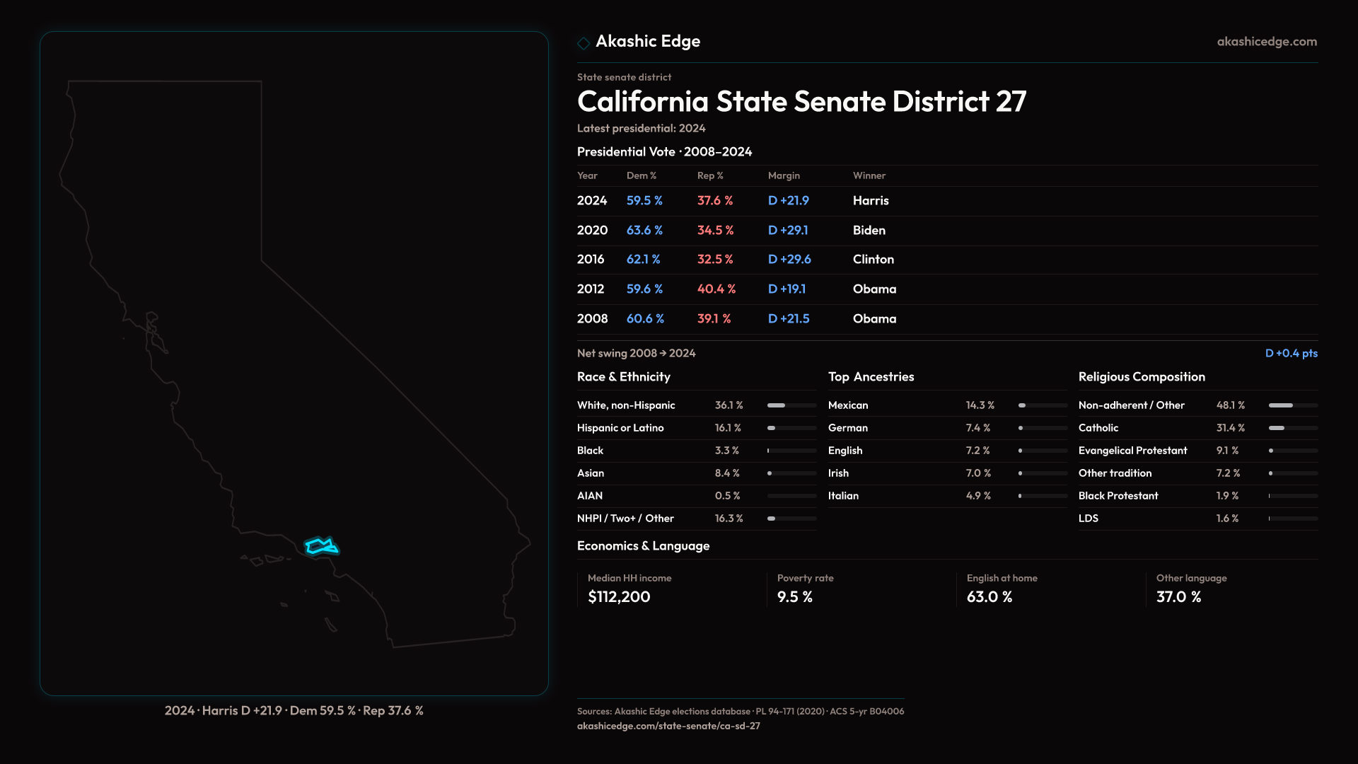 Who lives in California State Senate District 27? 991,307 residents as of the 2020 Census.