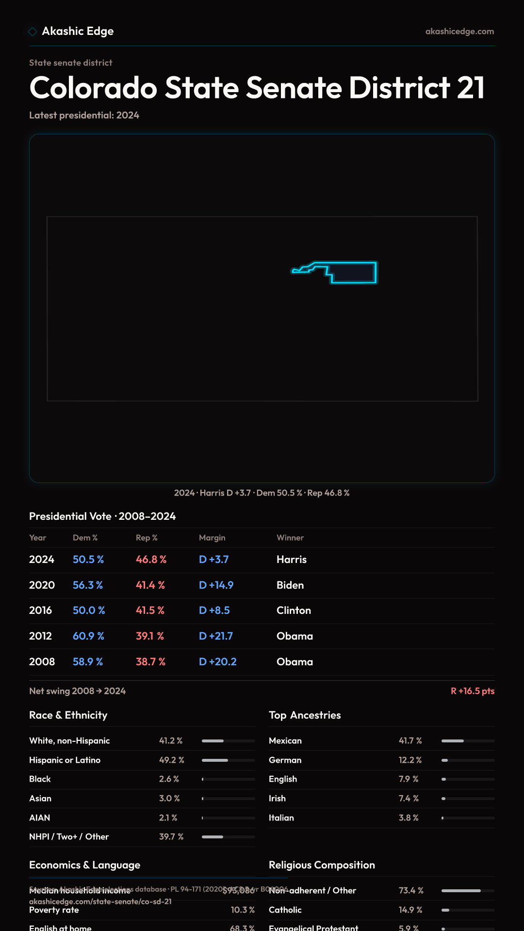 Who lives in Colorado State Senate District 21? 168,413 residents as of the 2020 Census.