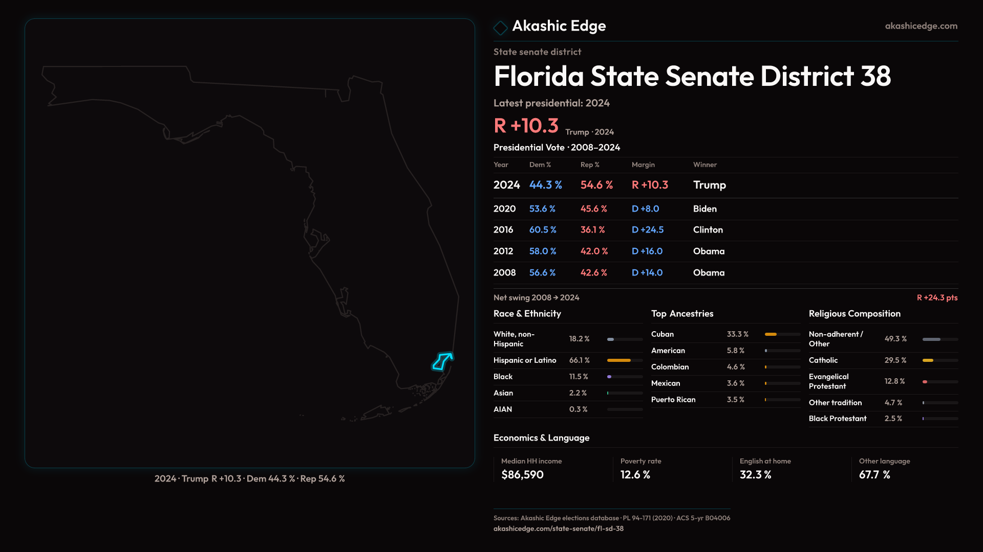 Leans Republican — shifted 18.3pp toward Republicans in 2024 — 544K residents