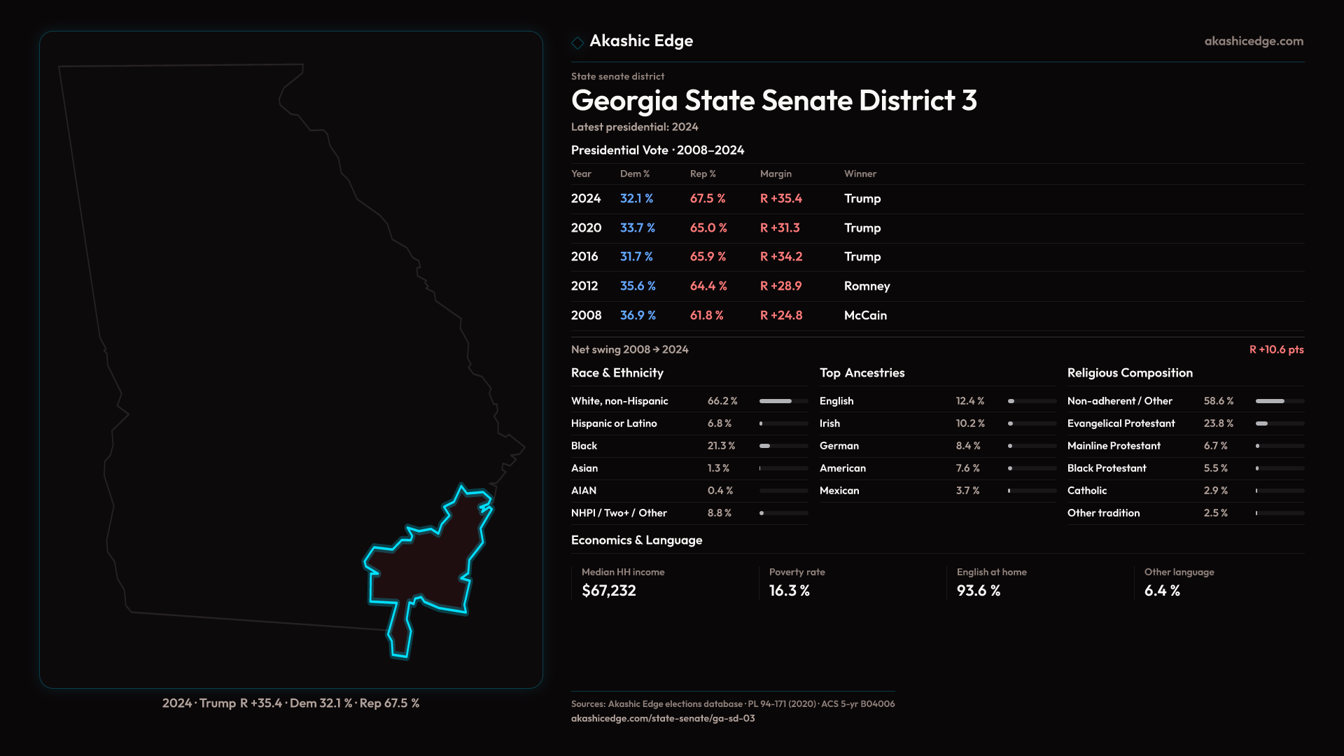 Read this geography's profile in three layers: local, state (where available), and national baseline.