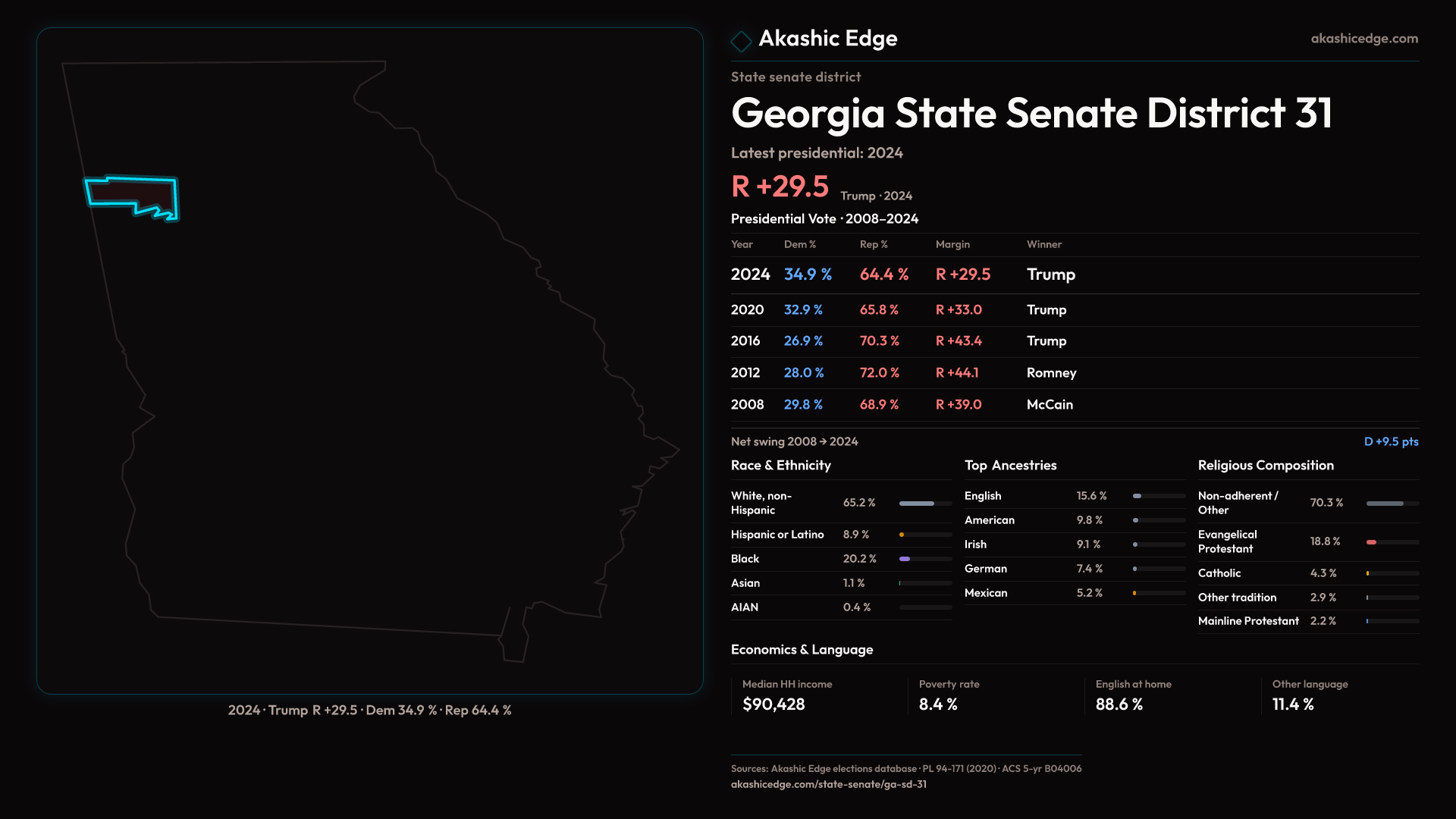 Read this geography's profile in three layers: local, state (where available), and national baseline.