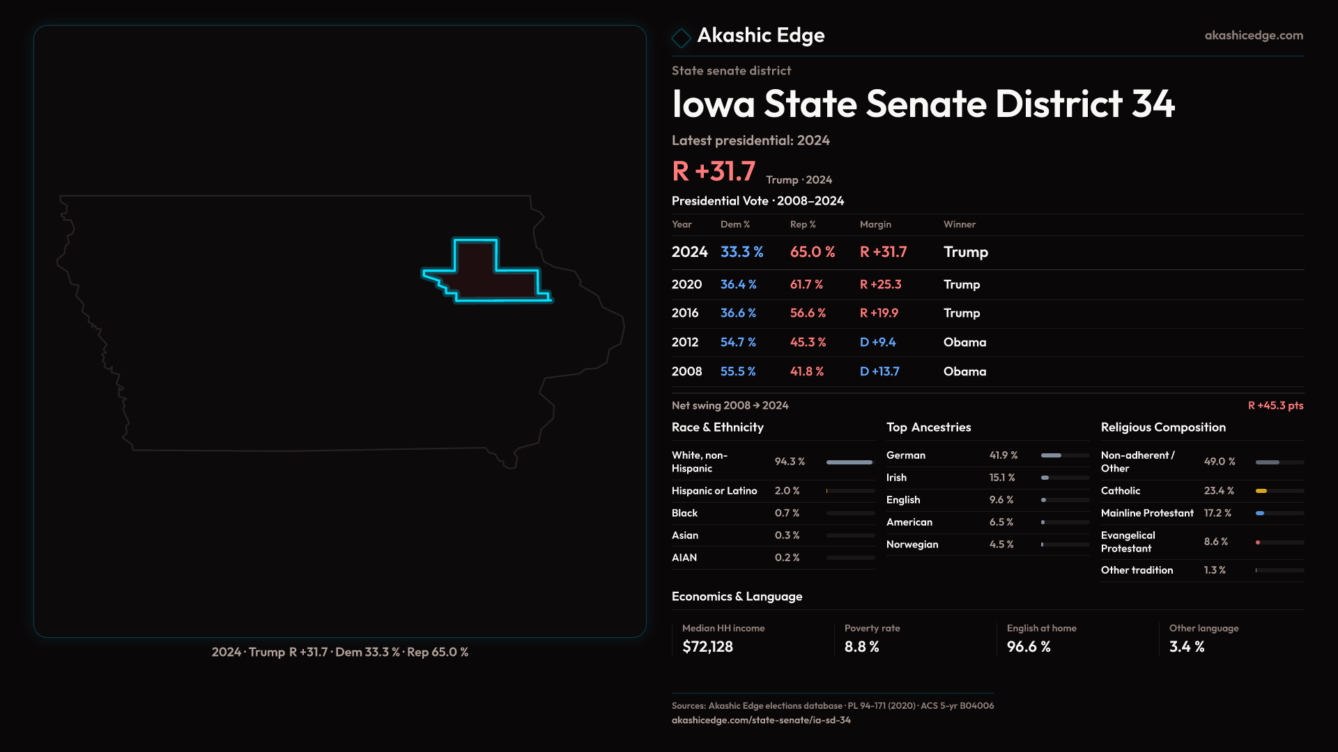 Who lives in Iowa State Senate District 34? 63,469 residents as of the 2020 Census.