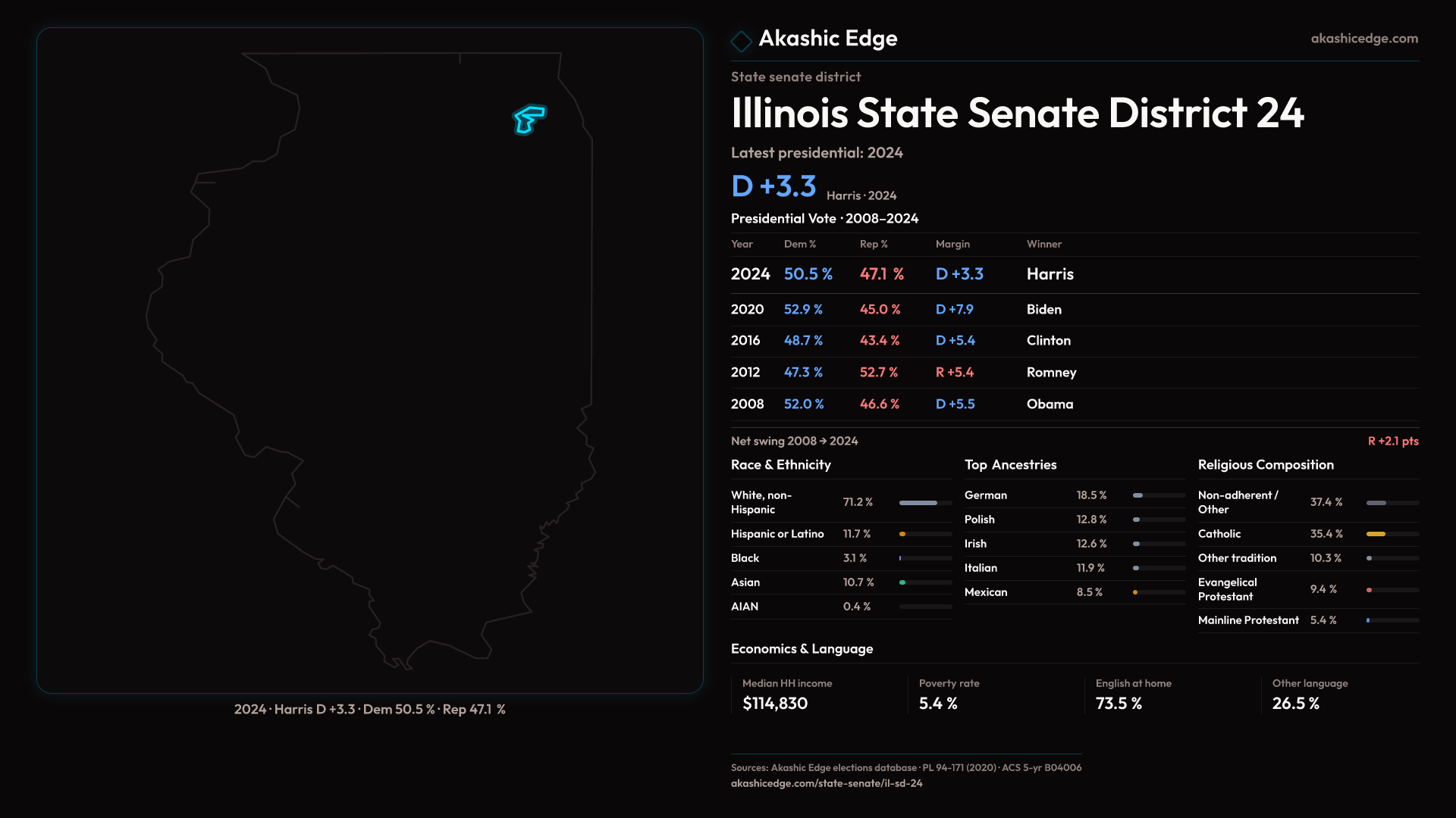 Who lives in Illinois State Senate District 24? 217,189 residents as of the 2020 Census.