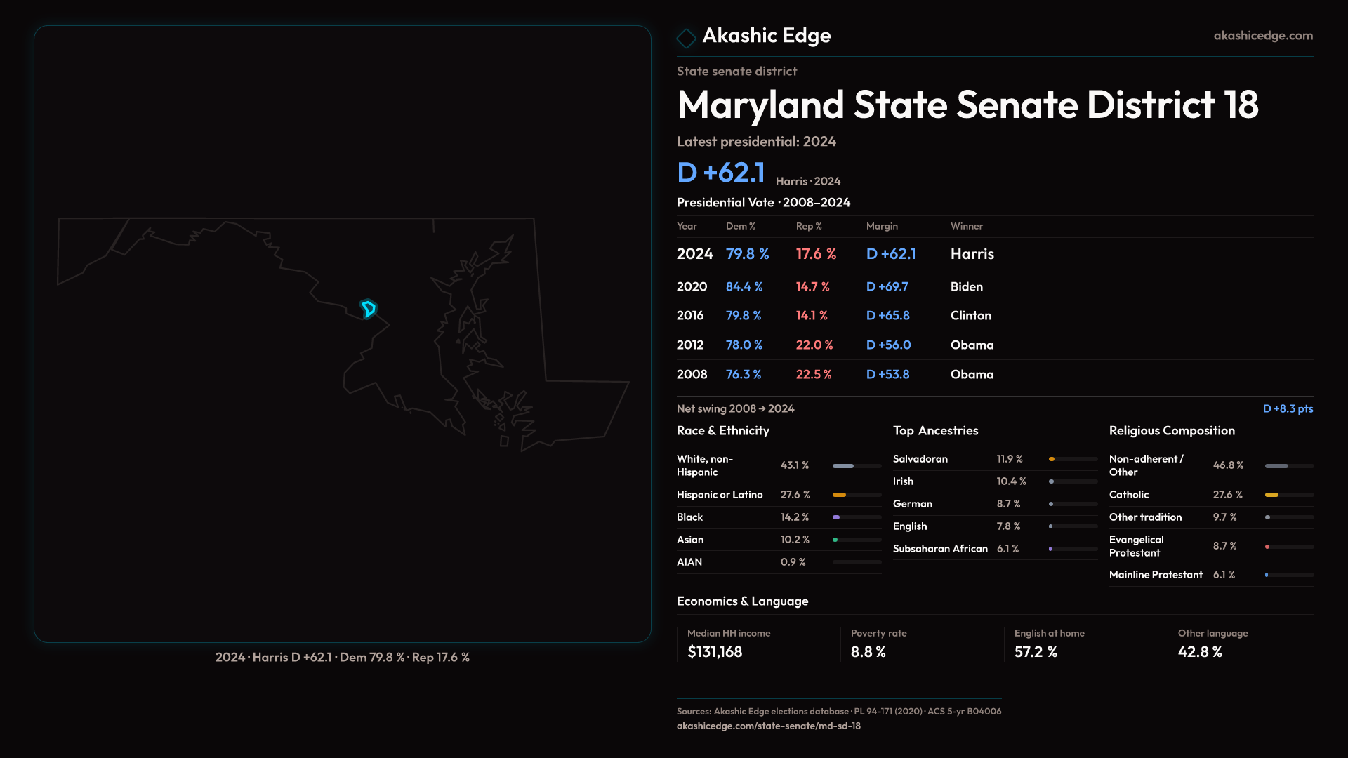 Safe Democratic — shifted 7.5pp toward Republicans in 2024 — 128K residents