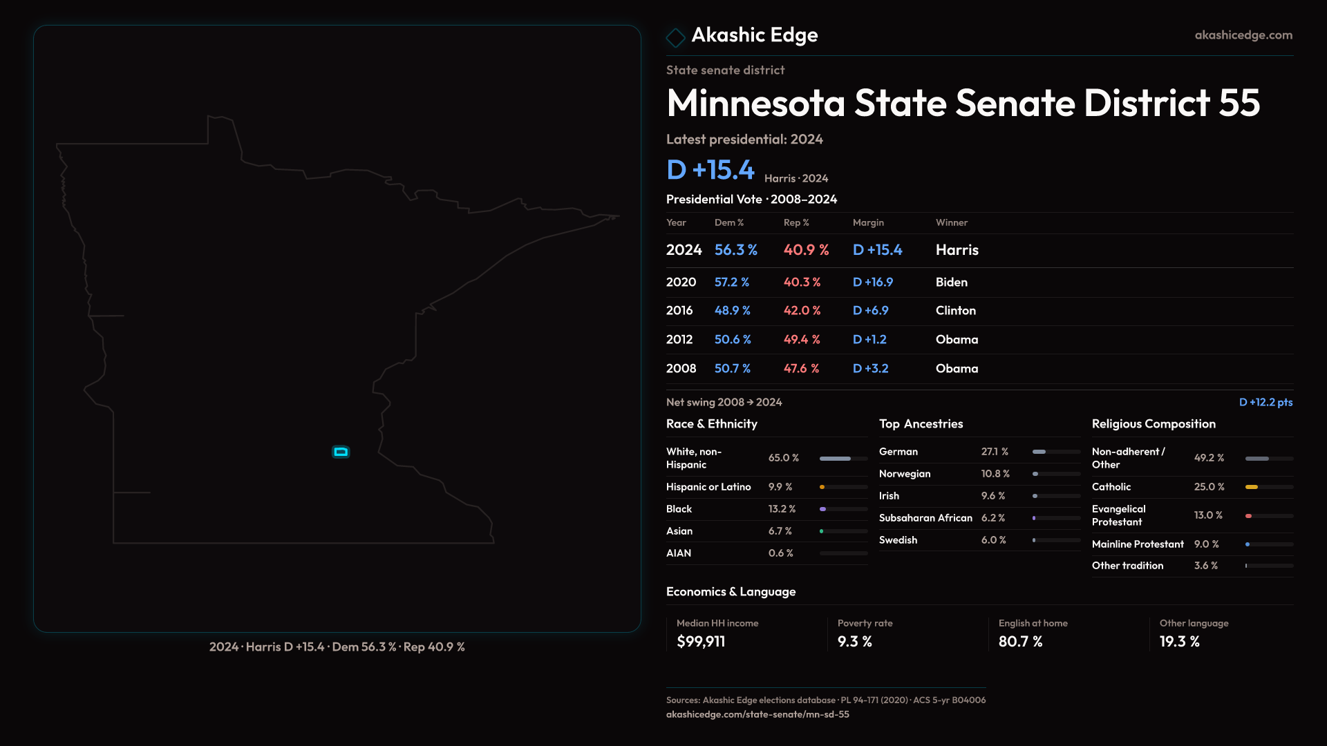 Who lives in Minnesota State Senate District 55? 85,190 residents as of the 2020 Census.