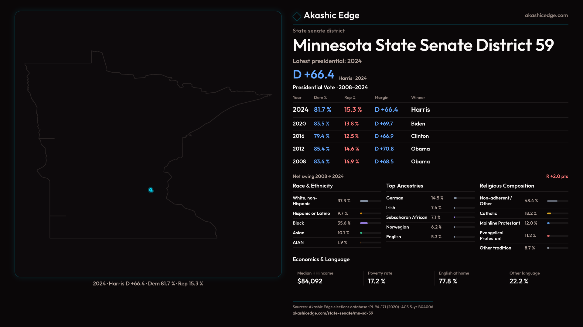 Who lives in Minnesota State Senate District 59? 84,924 residents as of the 2020 Census.