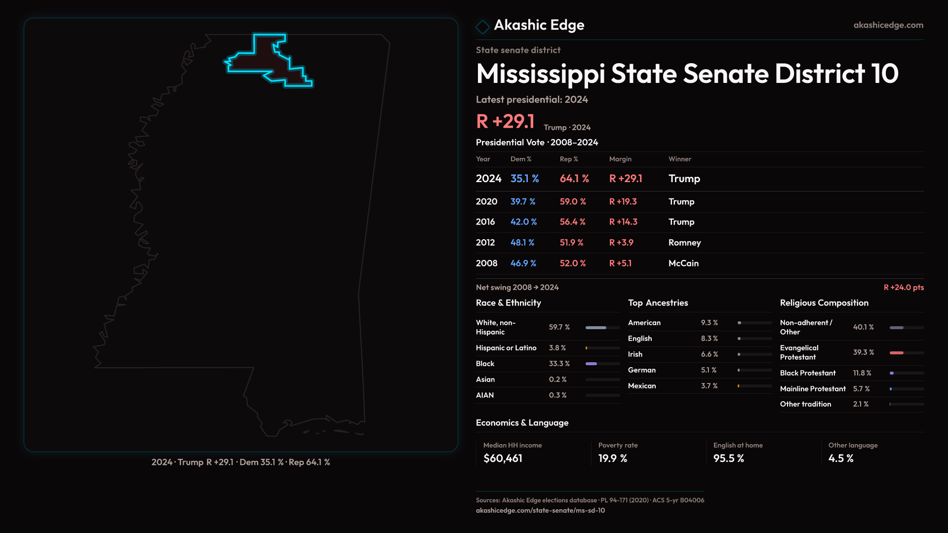 Safe Republican — shifted 9.7pp toward Republicans in 2024 — 59K residents