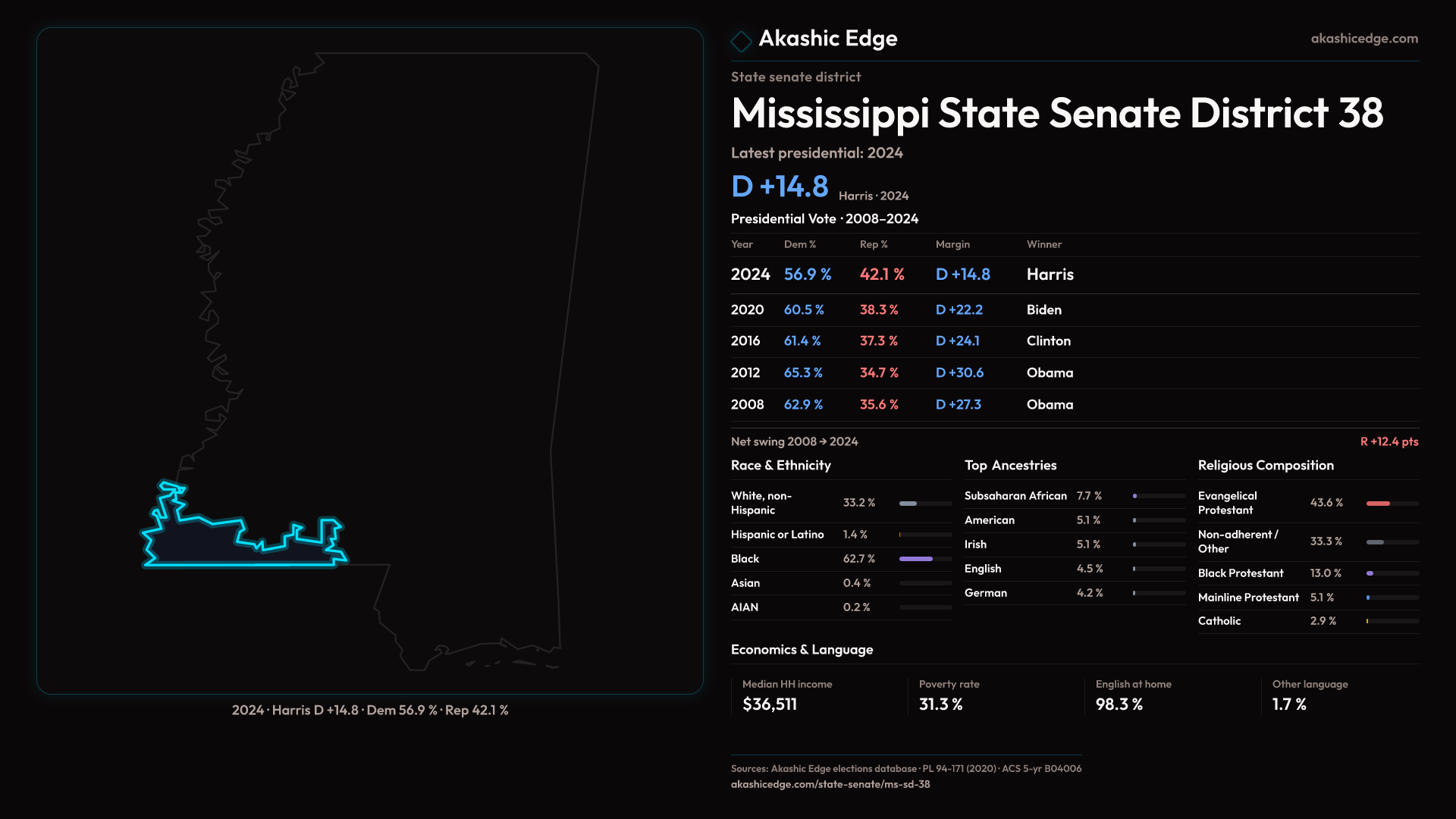 13% of adults hold a bachelor's degree — 20pp below the national average. Places with similar education levels vote R+28 on average nationally.