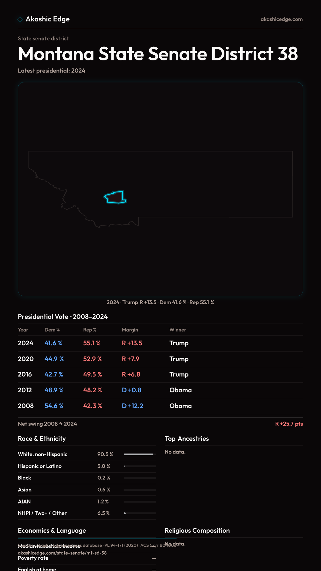 Who lives in Montana State Senate District 38? 21,357 residents as of the 2020 Census.