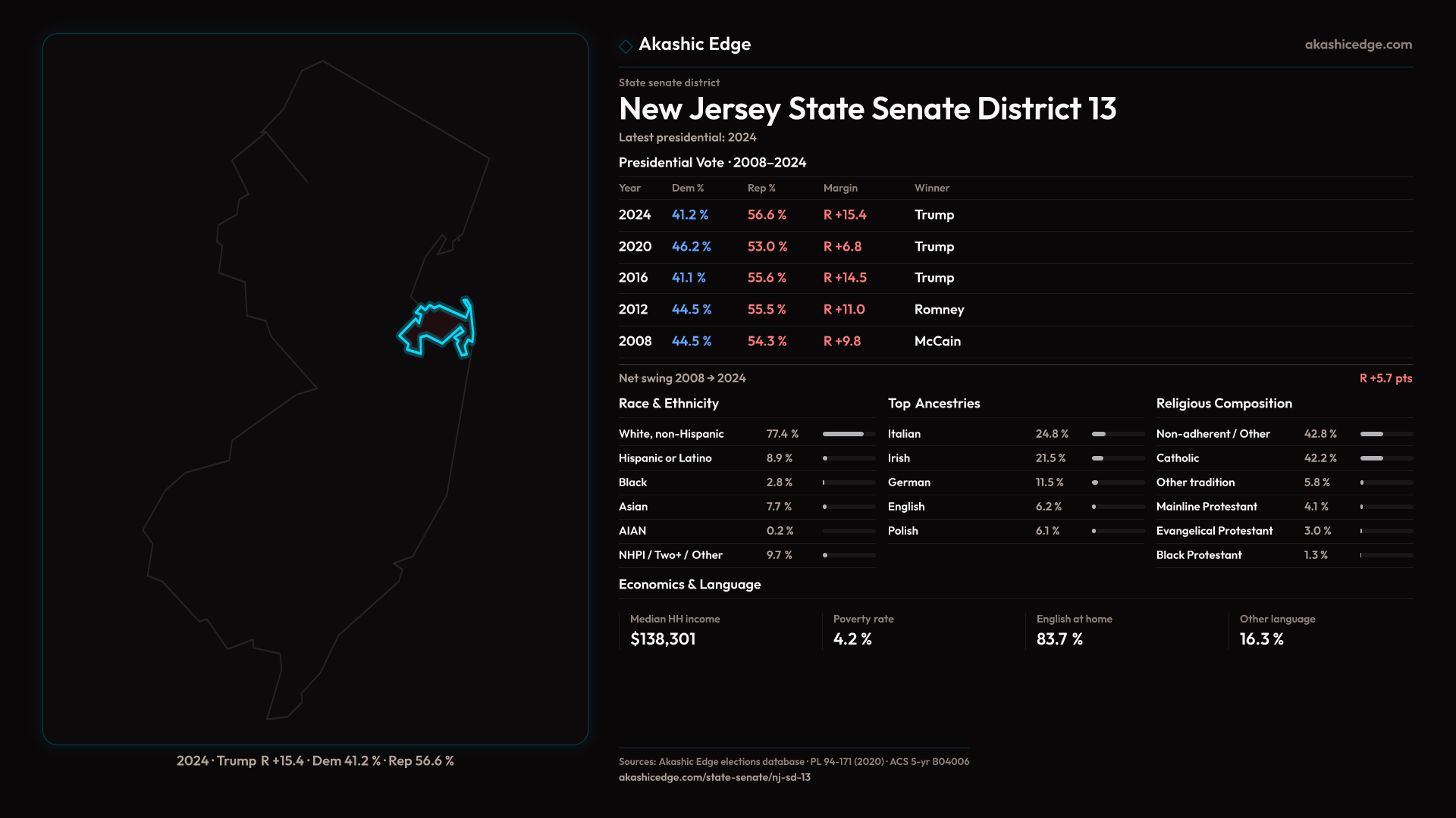 Who lives in New Jersey State Senate District 13? 230,007 residents as of the 2020 Census.