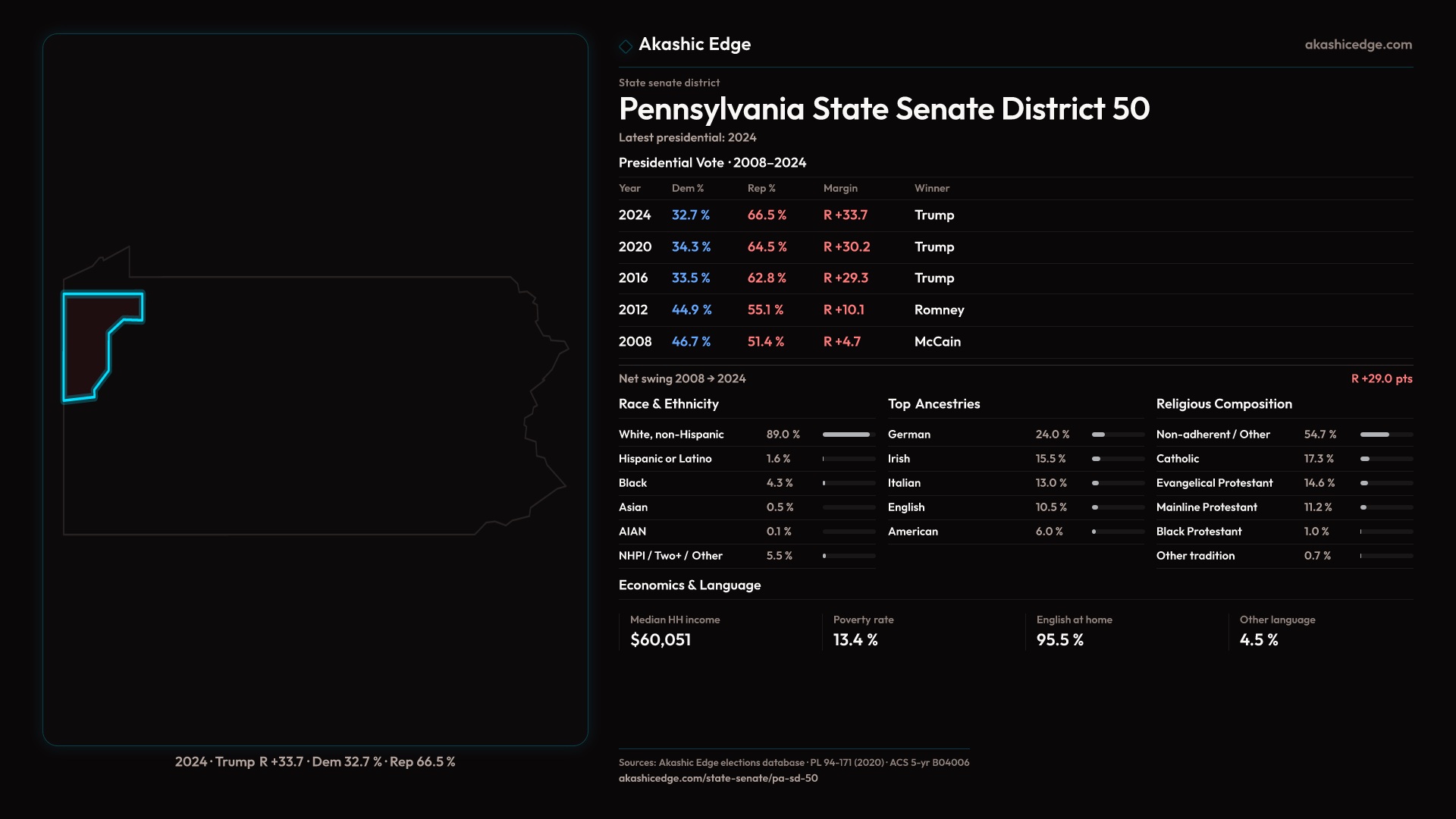 Read this geography's profile in three layers: local, state (where available), and national baseline.