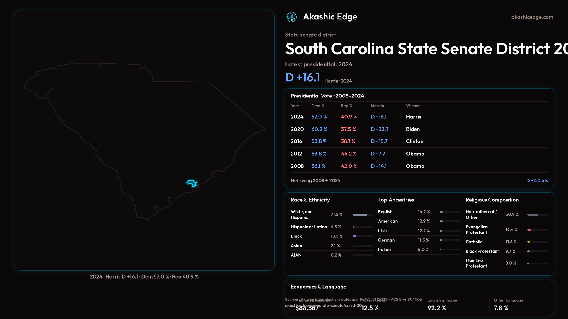 Open SC-SD-20 in Explore for full precinct-level analysis, compare against any peer cohort, or ask a free-form question.