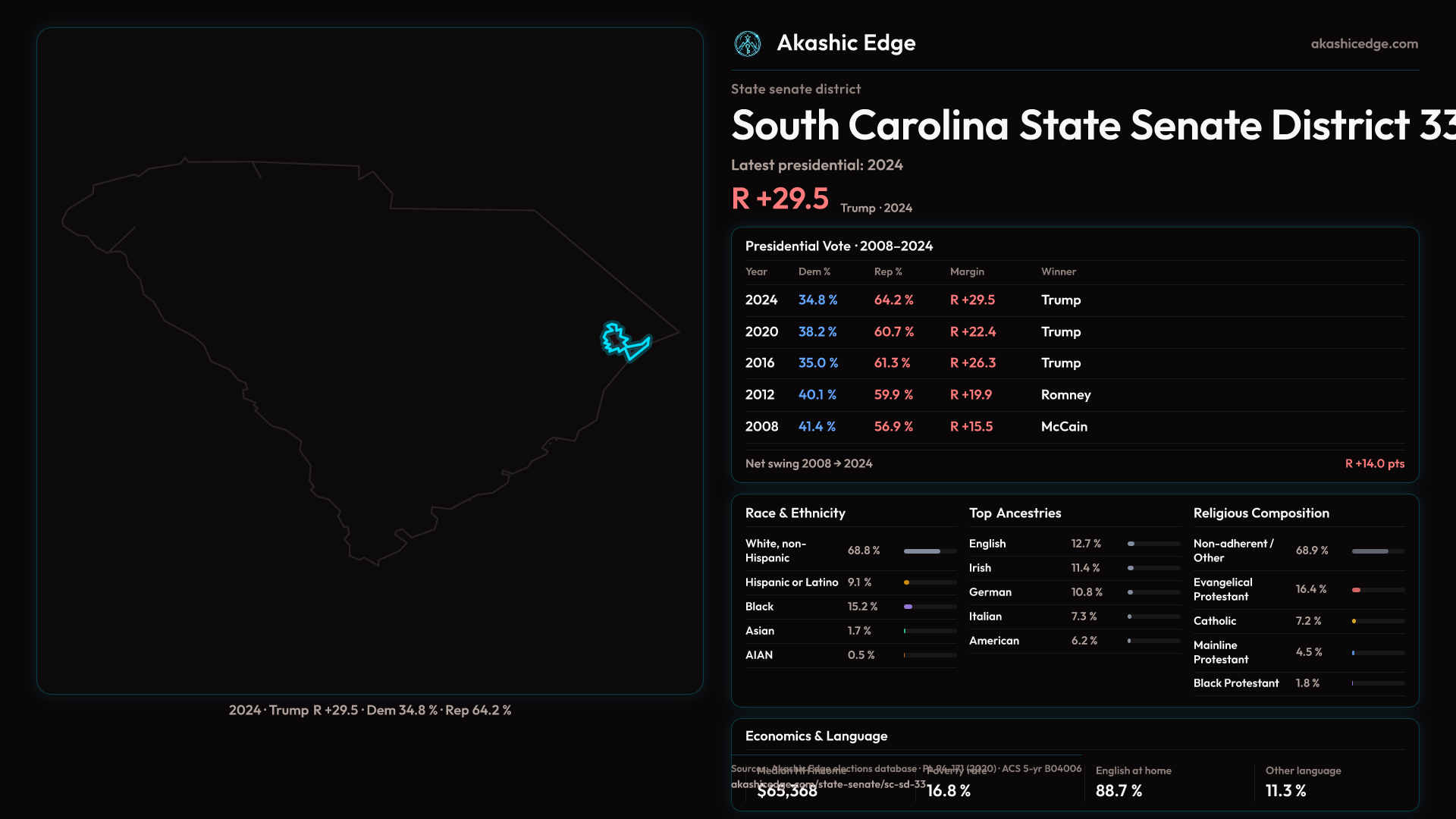 Read this geography's profile in three layers: local, state (where available), and national baseline.