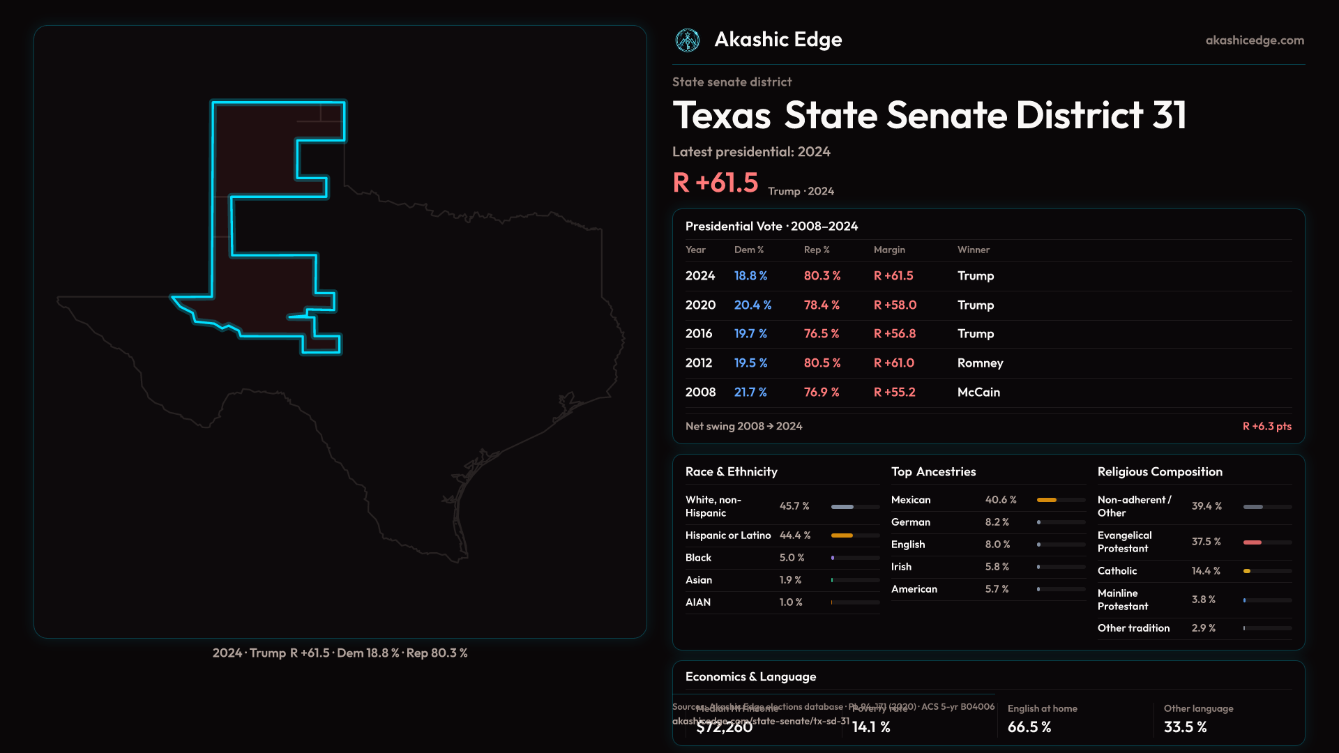 Read this geography's profile in three layers: local, state (where available), and national baseline.