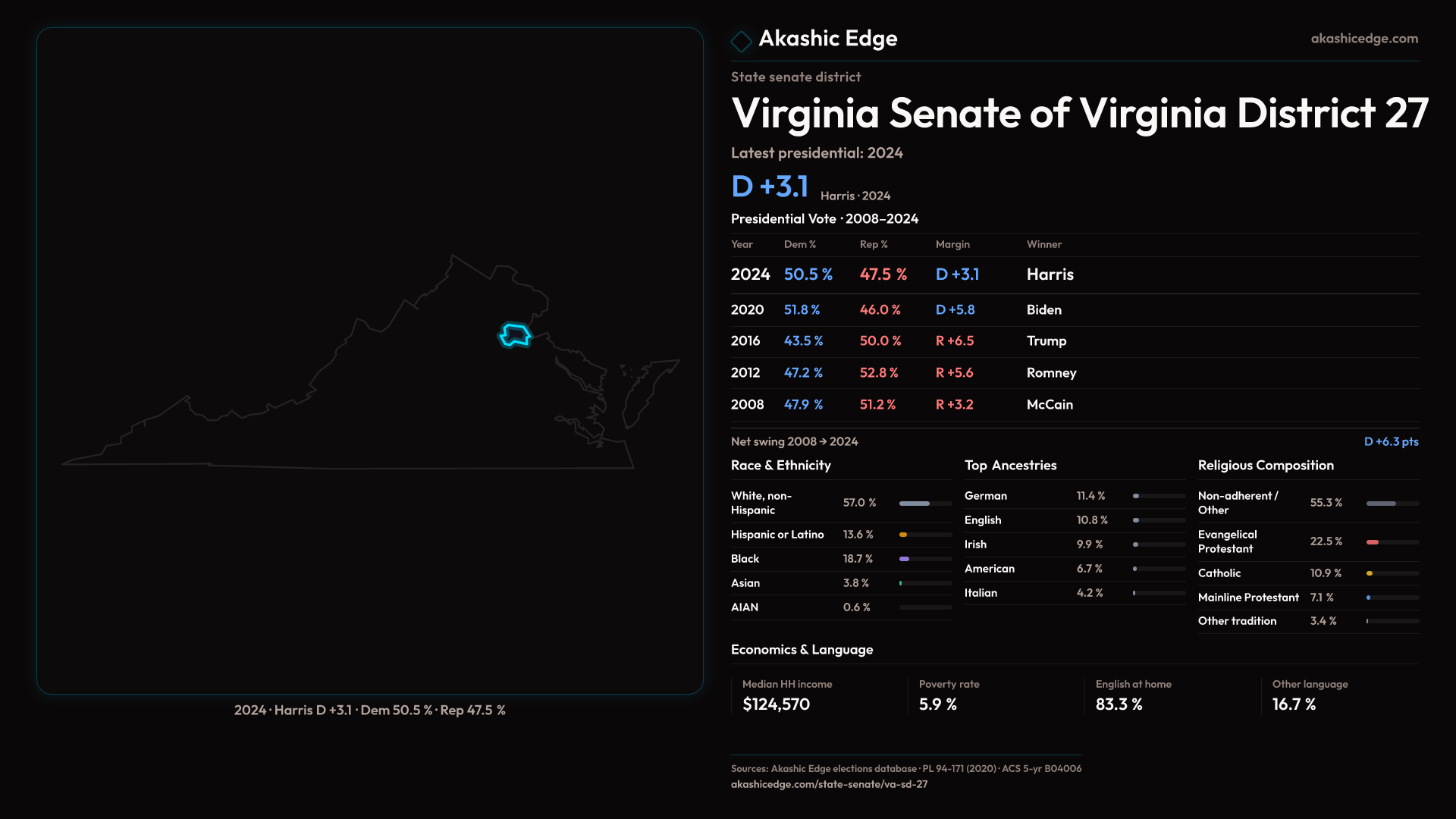 Who lives in Virginia Senate of Virginia District 27? 213,387 residents as of the 2020 Census.